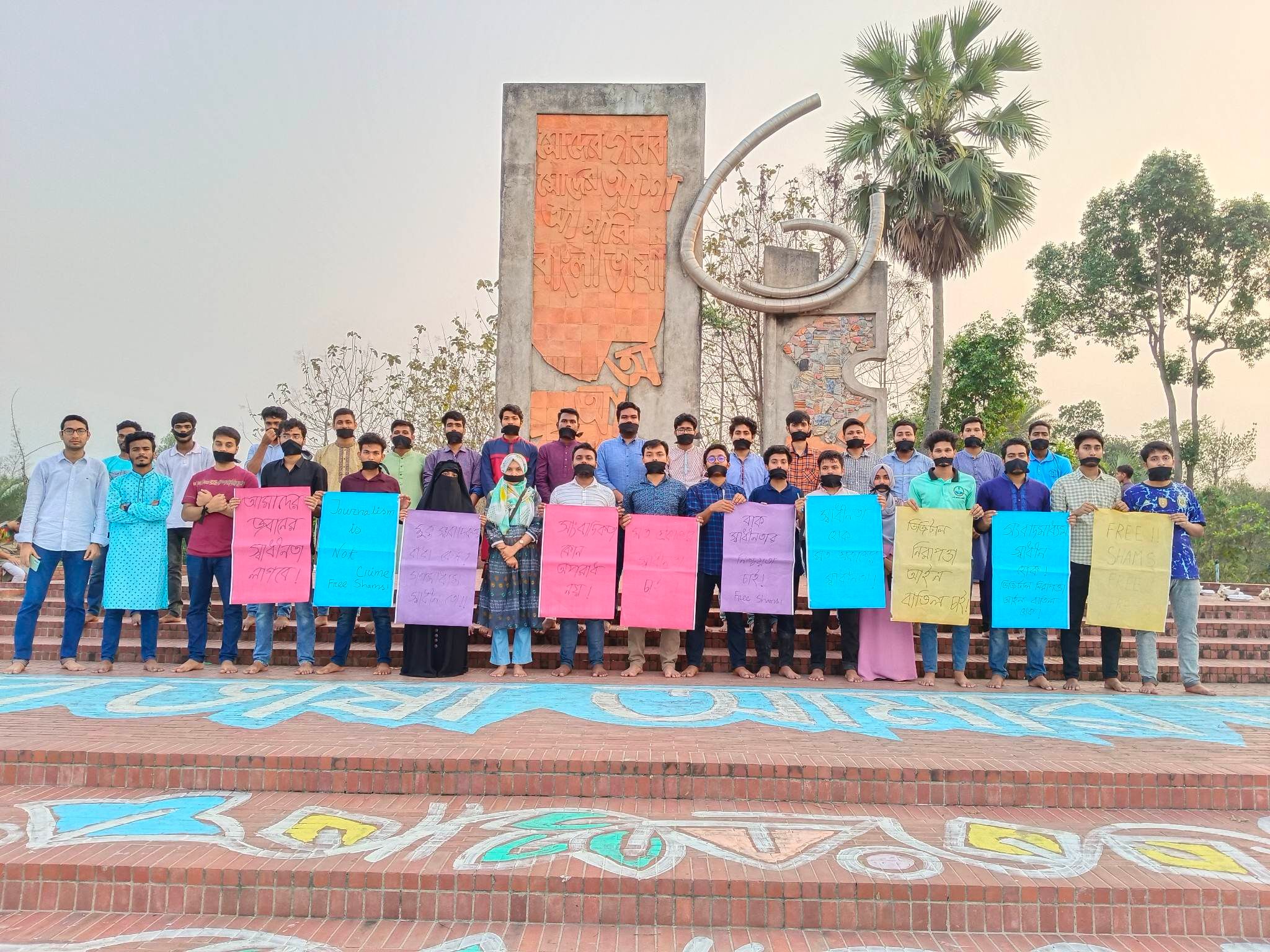 এ সময় তারা ‘মত প্রকাশের স্বাধীনতা চাই’,’সাংবাদিকতা কোন অপরাধ নয়’, ‘আমাদের জবানের স্বাধীনতা লাগবে’, ‘শামসুজ্জামানের মুক্তি চাই’ ইত্যাদি লেখা বিভিন্ন প্ল্যাকার্ড হাতে নিয়ে অংশগ্রহণ করেন।