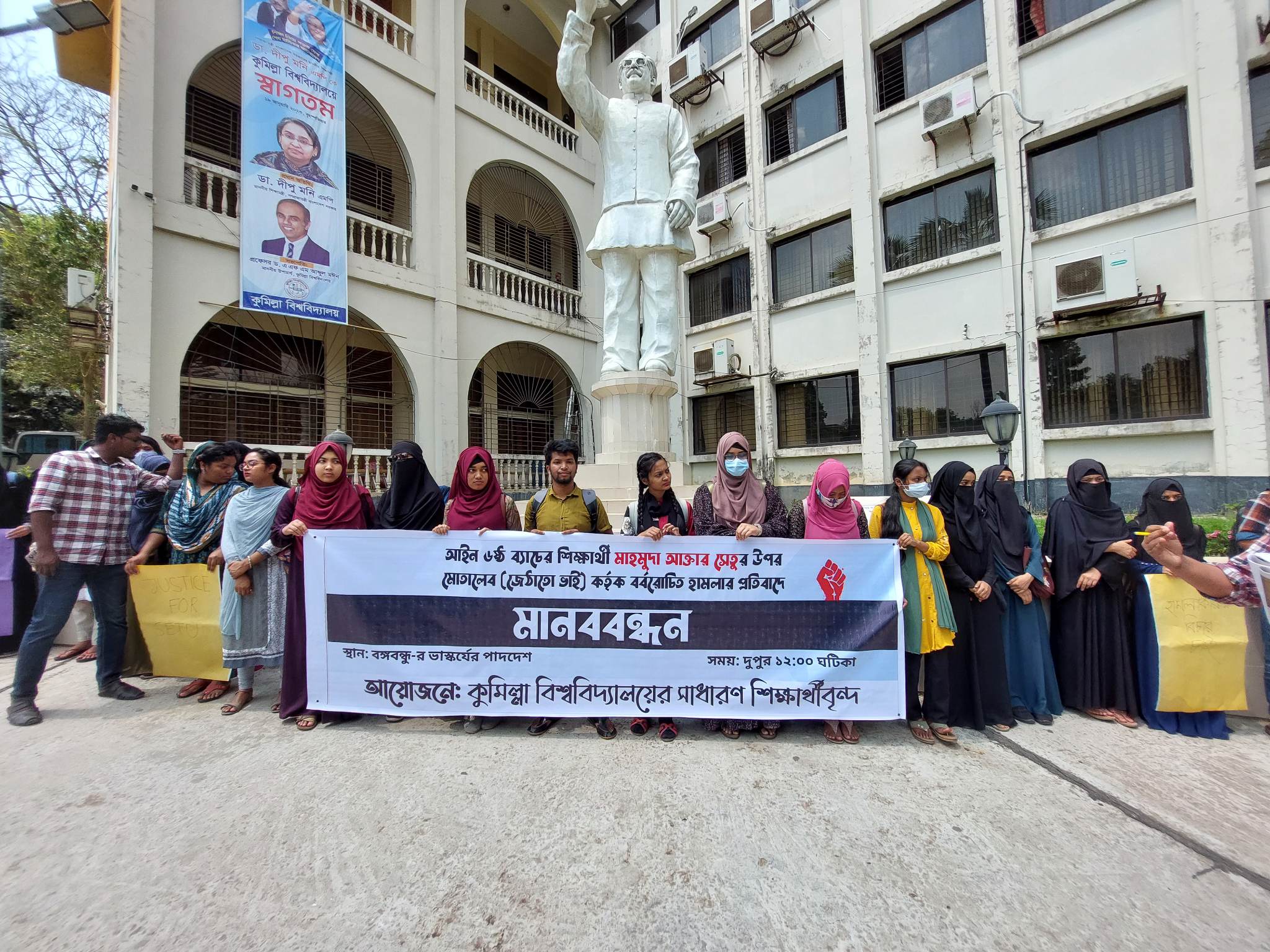 মানববন্ধনে শিক্ষার্থীরা হামলাকারীর জামিন নামঞ্জুর করে আসামিকে বিচারের আওতায় আনার দাবি জানান।