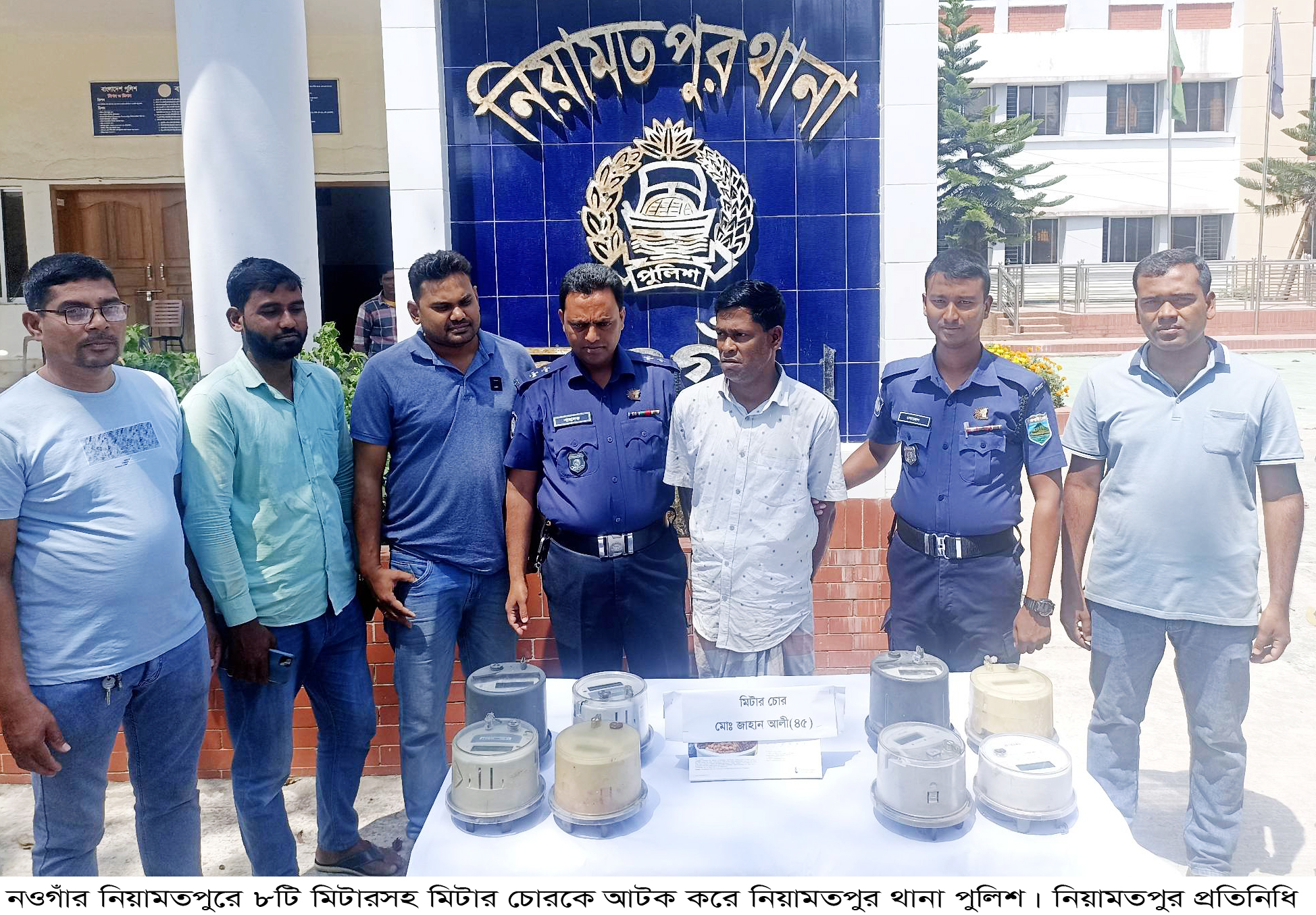 গত ৪ এপ্রিল দিবাগত রাতে নওগাঁ পুলিশ সুপার মুহাম্মাদ রাশিদুল হকের সার্বিক দিক নির্দেশনায় মান্দা সার্কেল সিনিয়র সহকারী পুলিশ সুপার মোঃ মতিয়ার রহমানের তত্ত¡াবধানে এবং নিয়ামতপুর থানার অফিসার ইন চার্জ আসাদুজ্জামানের নেতৃত্বে নিয়ামতপুর থানার একটি চৌকস পুলিশ টিম জেলার বিভিন্ন উপজেলায় অভিযান চালিয়ে ৮টি বৈদ্যুতিক মিটারসহ জেলার সাপাহার উপজেলার থেকে এক বৈদ্যুতিক মিটার চোরকে আটক করে। আটককৃত চোর বগুড়া জেলার আদমদীঘি উপজেলার বড়আখিড়া গ্রামের মৃত- সামির উদ্দিন ওরফে ছহির উদ্দিনের ছেলে জাহান আলী ওরফে বাবু (৪৫)। এ বিষয়ে নিয়ামতপুর থানার অফিসার ইন চার্জ এক প্রেস রিলিজ প্রদান করেন।