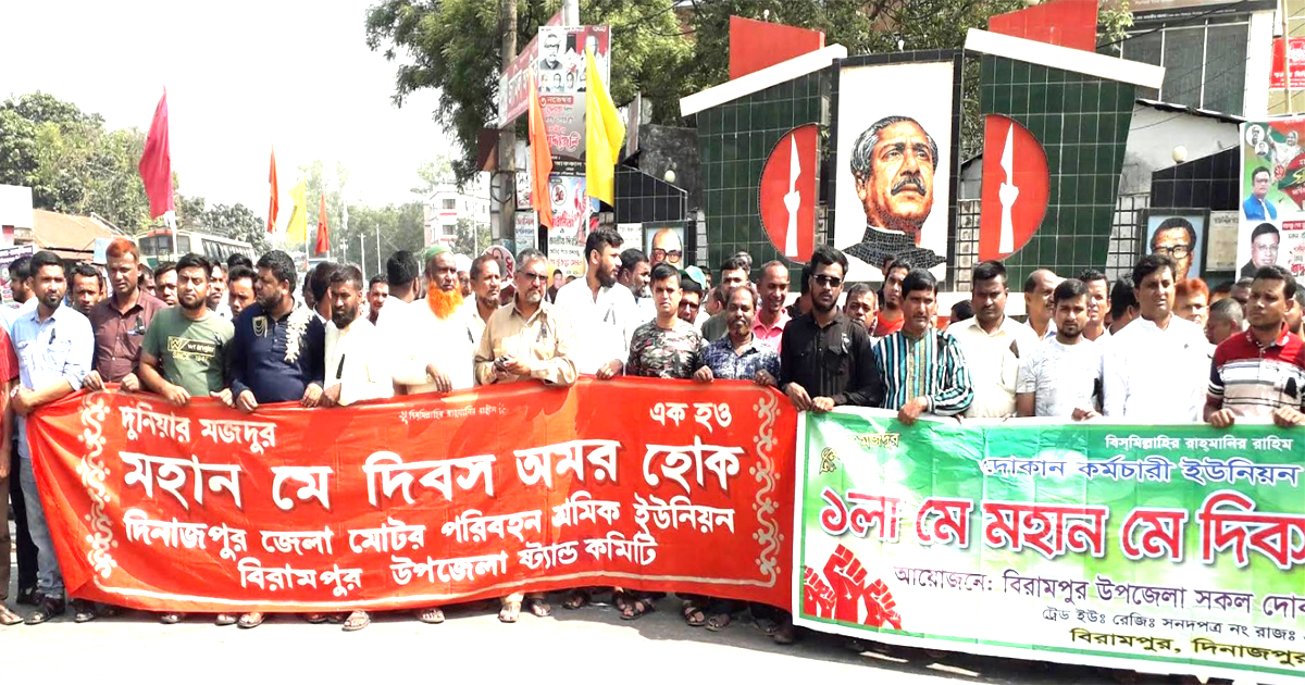দিনাজপুরের বিরামপুরে ১লা মে, সোমবার বিভিন্ন কর্মসূচির মধ‍্য দিয়ে মহান মে দিবস তথা আন্তর্জাতিক শ্রমিক দিবস পালিত হয়েছে।