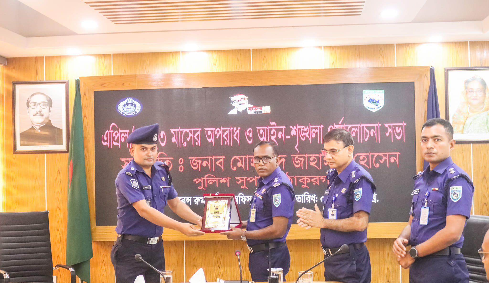 মাসিক অপরাধ ও আইনশৃঙ্খলা পর্যালোচনা সভায় ঠাকুরগাঁওয়ের পুলিশ সুপার মোহাম্মদ জাহাঙ্গীর হোসেন শ্রেষ্ঠ থানা অফিসার ইনচার্জ (ওসি) একেএম আতিকুর রহমানকে স্বীকৃতি স্বরূপ সম্মাননা প্রদান করেন।