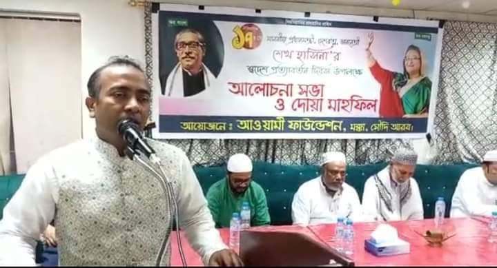 খলিল চৌধুরী,সৌদি আরব প্রতিনিধি-ঐতিহাসিক ১৭ই মে, জাতির পিতা বঙ্গবন্ধু শেখ মুজিবুর রহমানের সুযোগ্য উত্তরসূরী, গণতন্ত্রের মানসকন্যা, দেশরত্ন জননেত্রী শেখ হাসিনার স্বদেশ প্রত্যাবর্তন দিবস উপলক্ষে মক্কা আওয়ামী ফাউন্ডেশনের পক্ষ থেকে আয়োজিত আলোচনা সভা ও দোয়া মাহফিল সংগঠনের সহ-সভাপতি জনাব আমীর হোসেনের সভাপতিত্বে ও যুগ্ম সাধারণ সম্পাদক সেলিম আহমেদ এবং দপ্তর সম্পাদক মোরশেদুল আলম নিবিলের:যৌথ পরিচালনায় মক্কা মিছফালাহ হোটেল হারামাইনের বলরুমে অনুষ্ঠিত হয়।