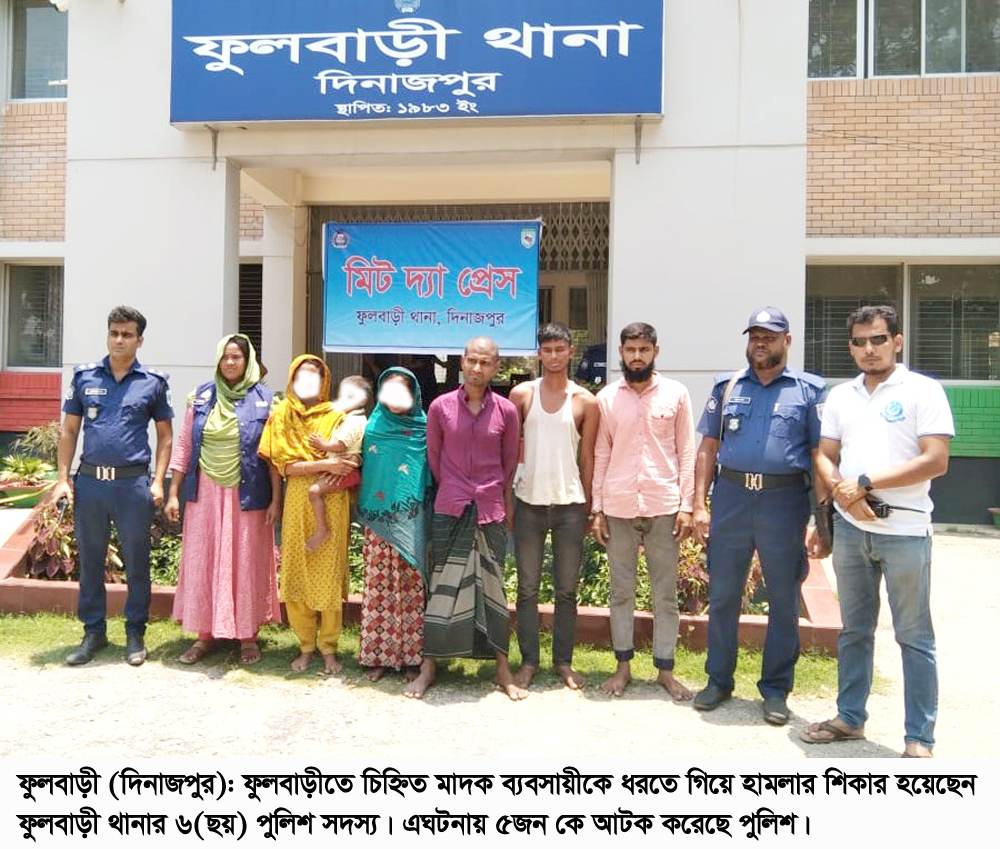 মেহেদীহাসান,ফুলবাড়ী(দিনাজপুর)প্রতিনিধি;দিনাজপুরের ফুলবাড়ীতে আসামী ধরতে গিয়ে মাদক ব্যবসায়ীর হাতে ৬ (ছয়) পুলিশ সদস্য হামলার শিকার হয়েছেন। এঘটনায় ৫জন কে আটক করেছে পুলিশ।