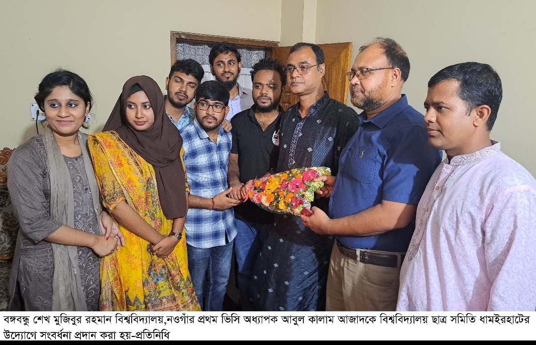 এ ব্যাপারে বিশ্ববিদ্যালয় ছাত্র সমিতি ধামইরহাটের উপদেষ্টা প্রভাষক মো.আবাবিল জানান, এ ছাত্র সমিতির উদ্যোগে বঙ্গবন্ধু শেখ মুজিবুর রহমান বিশ্ববিদ্যালয়,নওগাঁ এর প্রথম উপাচার্য হিসেবে নওগাঁর সন্তান অধ্যাপক আবুুল কালাম আজাদ কে নিয়োগ দেওয়ায় তাঁর নিজস্ব বাসভবনে সৌজন্য সাক্ষাৎকার, ফুলেল শুভেচ্ছা ও ক্রেস্ট প্রদান করা হয়।