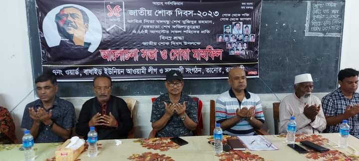 সোহানুল হক পারভেজ রাজশাহী : তানোর উপজেলার বাধাইড় ইউনিয়নের ওয়ার্ড আওয়ামী লীগ ও সহযোগী সংগঠনের আয়োজনে জাতীয় শোক দিবস উপলক্ষে আলোচনা সভা ও দোয়া মোনাজাত অনুষ্ঠিত হয়েছে।