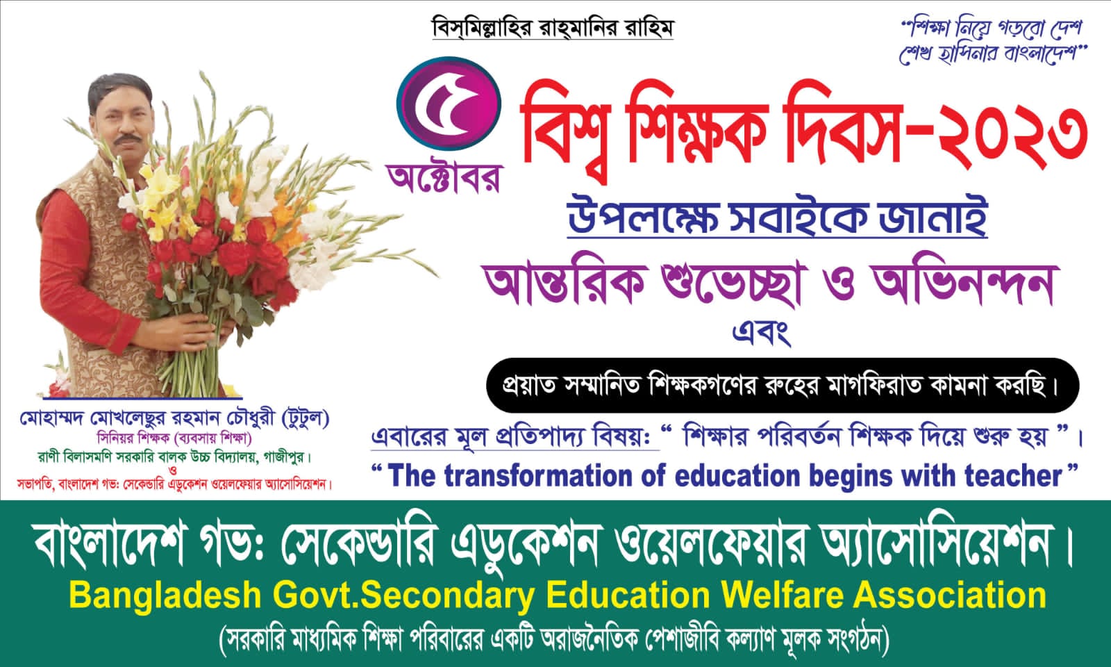 মুহাম্মদ আতিকুর রহমান, গাজীপুর জেলা প্রতিনিধি: ৫ অক্টোবর “বিশ্ব শিক্ষক দিবস-২০২৩” উপলক্ষে বাংলাদেশ গভঃ সেকেন্ডারি (বিজিএস) এডুকেশন ওয়েলফেয়ার অ্যাসোসিয়েশনের সভাপতি ও রাণী বিলাসমনি সরকারি বালক উচ্চ বিদ্যালয়ের সিনিয়র শিক্ষক মোহাম্মদ মোখলেছুর রহমান চৌধুরী টুটুলের পক্ষ থেকে সবাইকে আন্তরিক শুভেচ্ছা ও অভিনন্দন জানিয়েছেন।