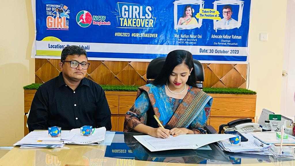 মু,হেলাল আহম্মেদ(রিপন), পটুয়াখালী জেলা প্রতিনিধিঃ আন্তর্জাতিক শিশু অধিকার সপ্তাহ ২০২৩ উপলক্ষে পটুয়াখালীতে “গার্লস টেক ওভার” কর্মসূচিতে এক ঘন্টার জন্য পটুয়াখালী জেলা পরিষদের চেয়ারম্যান এড হাফিজুর রহমানের পদে এক ঘন্টার জন্য প্রতীকী দায়িত্ব পালন করেছেন ১৬ বছর বয়সী কন্যা শিশু, এনসিটিএফ পটুয়াখালী জেলা শাখার সাধারণ সম্পাদক ও পটুয়াখালী সরকারি মহিলা কলেজের একাদশ শ্রেণীর শিক্ষার্থী নাফিউন নিহার অনি।