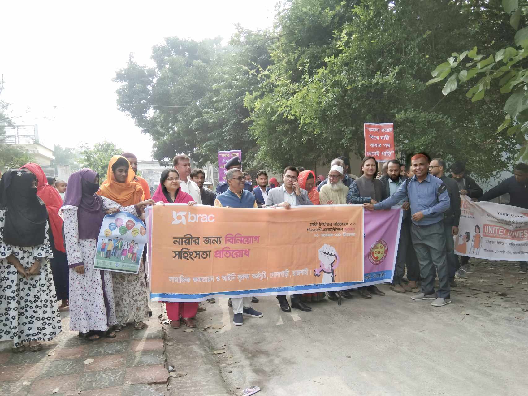 রবিউল ইসলাম মিনাল গোদাগাড়ী(রাজশাহী)প্রতিনিধিঃনারীর জন্য বিনিয়োগ সহিংসতা প্রতিরোধ জাতীয় প্রতিপাদ্যকে সামনে রেখে পালিত হচ্ছে আন্তর্জাতিক নারী নির্যাতন প্রতিরোধ প্রচার অভিযান রাজশাহী গোদাগাড়িতে উপজেলা প্রশাসন ও ব্র্যাক সামাজিক ক্ষমতায়ন ও আইনি সুরক্ষা কর্মসূচির আয়োজনে পালিত হলো আন্তর্জাতিক নারী নির্যাতন প্রতিরোধপক্ষ।