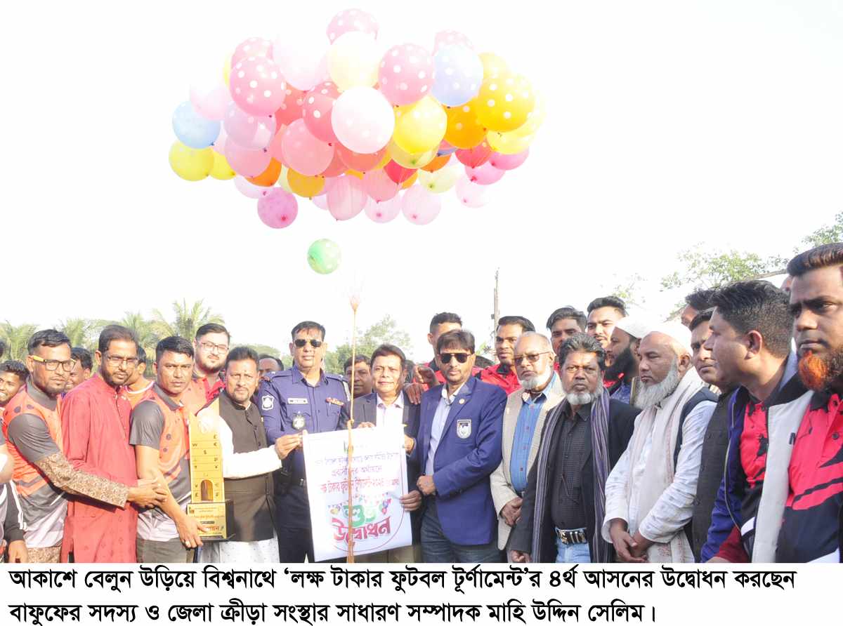বিশ্বনাথ প্রতিনিধি : আকাশে বেলুন উড়িয়ে সিলেটের বিশ্বনাথ উদ্বোধন করা হয়েছে ‘লক্ষ টাকার ফুটবল ট‚র্ণামেন্ট’র ৪র্থ আসরের। বৃহস্পতিবার (৮ ফেব্রুয়ারী) বিকেলে পৌর শহরের জানাইয়া (মশুলা) গ্রামের মাঠে ১৬ দলের অংশ গ্রহনে অনুষ্ঠিত টূর্ণামেন্টের উদ্বোধন করেন বাংলাদেশ ফুটবল ফেডারেশন (বাফুফে)’র কার্যনির্বাহী সদস্য ও সিলেট জেলা ক্রীড়া সংস্থার সাধারণ সম্পাদক মাহি উদ্দিন আহমদ সেলিম।