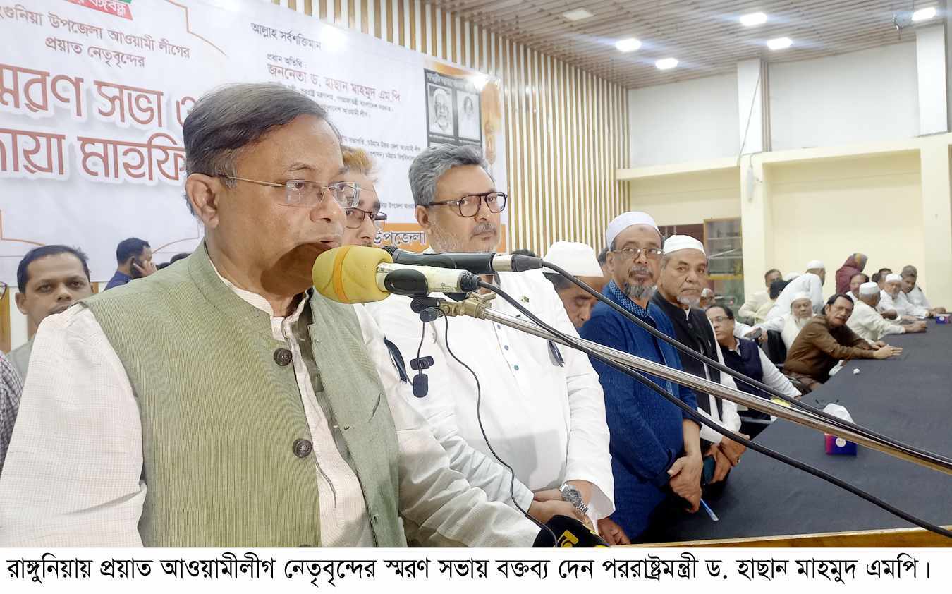 এরআগে রাঙ্গুনিয়া উপজেলা আওয়ামী লীগের প্রয়াত নেতৃবৃন্দের স্মরণ সভা ও দোয়া মাহফিলে প্রধান অতিথির বক্তব্যে ড. হাছান মাহমুদ বলেন, বাংলাদেশ আওয়ামীলীগ খেটে খাওয়া মানুষের দল, গণ মানুষের দল। যাদের স্মরণে আজকের এই স্মরণসভা তারা সবাই রাঙ্গুনিয়ায় আওয়ামীলীগকে দুঃসময়ে সংগঠিত করেছিল।