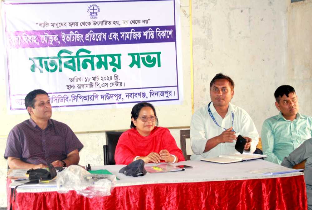 সোমবার দুপুরে উপজেলার রাঙ্গামাটি পিএস সেন্টারে সিসিডিবি-সিপিআরপি দাউদপুর নবাবগঞ্জ এর আয়োজনে এ সচেতনতামুলক সভা অনুষ্ঠিত হয়। আয়োজিত সভায় সভাপতিত্ব করেন উপজেলা মহিলা বিষয়ক কর্মকর্তা রিতা মন্ডল।