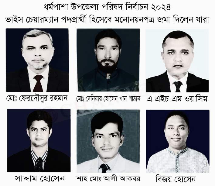 ধর্মপাশা উপজেলা আওয়ামী লীগের সাধারণ সম্পাদক শামীম আহমেদ বিলকিস, যুগ্ম সাধারণ সম্পাদক শামীম আহমেদ মুরাদ, উপজেলা বিএনপির সাংগঠনিক সম্পাদক মো. সাইফুল ইসলাম চৌধুরী ও কুয়েত প্রবাসী মো. বাশার তালুকদার। এ ছাড়া ভাইস চেয়ারম্যান (পুরুষ) পদে যারা মনোনয়নপত্র জমা দিয়েছিলেন তারা হলেন, মোঃ দেনিয়ার হোসেন খান পাঠান, শাহ মোঃ আলী আকবর, মোঃ ফেরদৌসুর রহমান, এ এইচ এম ওয়াসিম, সাদ্দাম হোসেন, বিজয় হোসেন ও ভাইস চেয়ারম্যান (মহিলা) পদে যারা মনোনয়নপত্র জমা দিয়েছেন তারা হলেন, ইয়াসমিন, অনামিকা আক্তার, মোছাঃ পিয়ারা আক্তার, রেশমা আক্তার, মর্জিনা আক্তার।