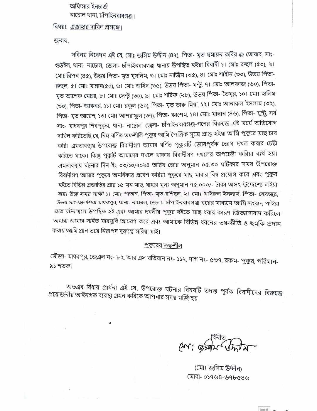 পৈত্রিক সূত্রে পাওয়া জমির প্রকৃত মালিক মোঃ জসীম উদ্দিন বলেন দীর্ঘদিন থেকে উক্ত পুকরটিতে মাছ চাষ করছি। ফ্যাসিস্ট সরকার পরিবর্তন হওয়ার পর হঠাৎ একদিন উপরে বর্ণিত সন্ত্রাসী বাহিনী দল আমার পুকুরটি জোরপূর্বক দখল করার চেষ্টা করে কিন্তু ঘটনাস্থলে আমি উপস্থিত থাকার কারণে ব্যর্থ হন। এমতাবস্থায় ঘটনার দিন গিয়ে রাতে সন্ত্রাসী বাহিনী দল আমার পুকুরে বিষ প্রয়োগ করে বিভিন্ন প্রজাতির সব মাছ চুরি করে নিয়ে যায়। মাধবপুর গ্রামের মৃত রশিদুলের ছেলে পাতান ও হেবজুরের ছেলে খাইরুল মুঠোফোনে আমাকে মাছ মারার খবর দিলে দ্রুত ঘটনাস্থলে উপস্থিত হয়ে কেন মাছ মারলেন এ কথা বললে সন্ত্রাসী বাহিনীরা বলেন এখান থেকে চলে যা না হলে প্রানে মেরে ফেলবো। আইনের প্রতি শ্রদ্ধা রেখে জীবন বাঁচাতে আমি পালিয়ে এসে থানায় গিয়ে এজাহার দায়ের করি ।