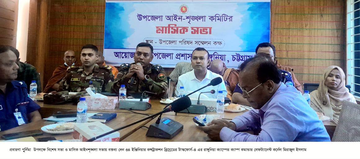 চট্টগ্রামের রাঙ্গুনিয়ায় উপজেলা প্রশাসন এর আয়োজনে প্রবারণা পুূর্নিমা উপলক্ষে বিশেষ সভা ও মাসিক আইনশৃঙ্খলা সভায় তিনি একথা বলেন। মঙ্গলবার ( ১৫ অক্টোবর) দুপুরে উপজেলা পরিষদ সম্মেলন কক্ষে আয়োজিত সভায় সভাপতিত্ব করেন উপজেলা নির্বাহী কর্মকর্তা (ইউএনও) মাহমুদুল হাসান। দিকনির্দেশনামূলক বক্তব্যে লেফটেনেন্ট কর্নেল মো. মিরাজ আরো বলেন,“ সবার সম্মিলিত প্রচেষ্ঠায় সনাতন সম্প্রদায়ের দুর্গাপূজা কোনো অপ্রীতিকর ঘটনায় ছাড়াই শেষ হয়েছে। সকল সম্প্রদায়ের মানুষের ধর্মীয় আচার—অনুষ্ঠান পালনে যাতে কোনো বিঘ্ন্ না হয় সেজন্য যার যার অবস্থান থেকে সজাগ থাকতে হবে। বৌদ্ধদের মাসব্যাপি কঠিন চীবর দানোৎসব যাতে নির্বিঘ্ন হয় সেনাবাহিনীর বিশেষ নজরদারি থাকবে।