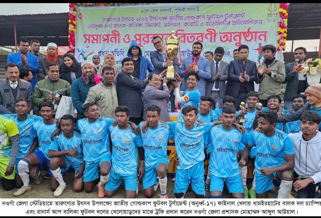 মাসুদ সরকার, ধামইরহাট (নওগাঁ) প্রতিনিধিঃ তারুণ্যের উৎসব ২০২৫ উদযাপন উপলক্ষ্যে জাতীয় গোল্ডকাপ ফুটবল টুর্ণামেন্ট (অনুর্ধ্ব-১৭) ফাইনাল খেলা অনুষ্ঠিত হয়েছে। গত বৃহস্পতিবার বিকালে নওগাঁ জেলা স্টেডিয়াম মাঠে জেলা প্রশাসন ও জেলা অফিসের আয়োজনে এ ফুটবল খেলা অনুষ্ঠিত হয়। উক্ত খেলায় ধামইরহাট উপজেলা বালক ফুটবল দল নওগাঁ পৌরসভা ফুটবল দলকে ১-০ গোলে পরাজিত করেন। এর আগে ধামইরহাট বালিকা ফুটবল দল বদলগাছি বালিকা দলের সঙ্গে ২-০ গোলে রানার্স আপ ট্রফি অর্জন করেন। প্রথম স্থান অধিকারি বালক ফুটবল দল এবং রানার্স আপ অর্জনকারি বালিকা ফুটবল দলের মাঝে ট্রফি প্রদান করেন নওগাঁ জেলা প্রশাসক মোহাম্মদ আব্দুল আউয়াল। এসময় উপস্থিত ছিলেন ধামইরহাট উপজেলা নির্বাহী কর্মকর্তা মো. মোস্তাফিজুর রহমান, জাতীয় ফুটবল দলের সাবেক তারকা ও রাজশাহী বিভাগীয় ফুটবল উন্নয়ন সমিতির সাধারণ সম্পাদক মো. এনামুল হক, উপজেলা যুব উন্নয়ন কর্মকর্তা ও উপজেলা ক্রীড়া সংস্থার সদস্য সচিব মো. কামরুজ্জামান সরদার, উপজেলা ক্রীড়া সংস্থার সদস্য বিশিষ্ট ব্যবসায়িক ও ক্রীড়া সংগঠক মো. হানজালা, ধামইরহাট প্রেসক্লাবের সদস্য সচিব প্রভাষক আব্দুর রাজ্জাক রাজু, নওগাঁ জেলা ফুটবল উন্নয়ন সংস্থার যুুগ্ম সম্পাদক মেহেদী হাসান, ধামইরহাট ইউনিয়ন যুবদলের সাধারণ সম্পাদক মো. মোসাদ্দেক প্রমুখ।