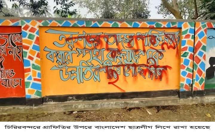 বিশেষ প্রতিনিধি: দিনাজপুরের চিরিরবন্দর উপজেলায় বিগত ফ্যাসিস্ট আওয়ামী সরকারের বিরুদ্ধে ছাত্র-জনতার জুলাই অভ্যুত্থানের স্মরণে বিভিন্ন দেয়ালে অঙ্কন করা গ্রাফিতির ওপর জয় বাংলা ও ছাত্রলীগ স্লোগান লিখে দেয়া হয়েছে।