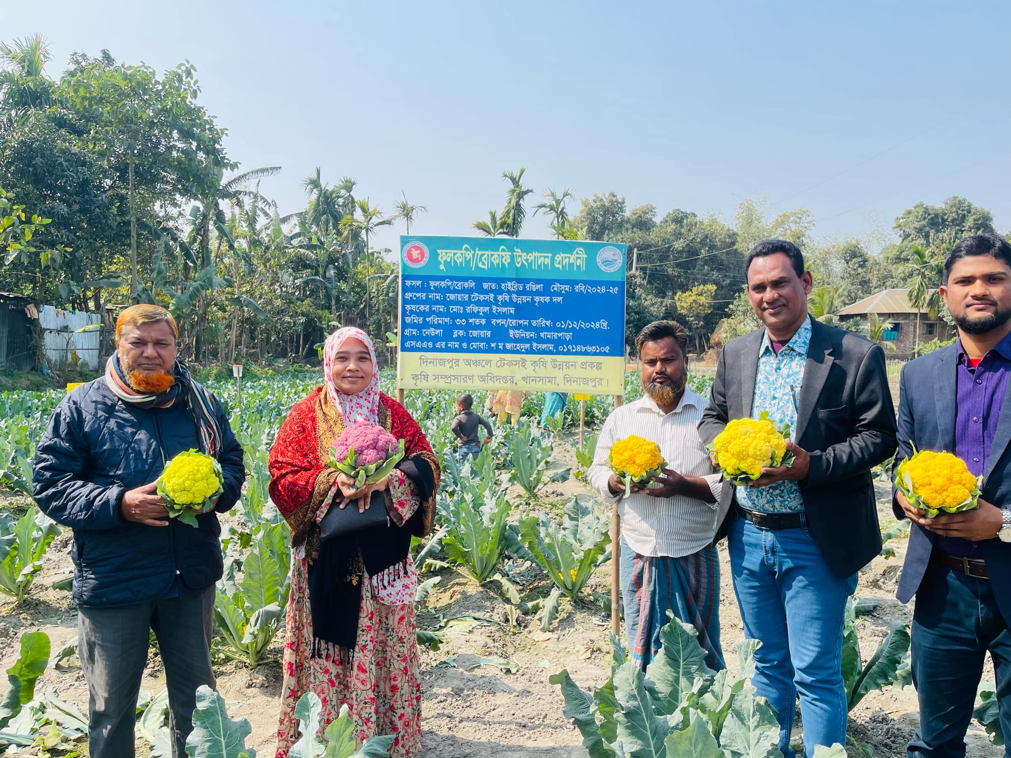 উপজেলা কৃষি বিভাগ জানায়, দিনাজপুর অঞ্চলে টেকসই কৃষি উন্নয়ন প্রকল্পের আওতায় রঙিন ফুলকপি চাষ শুরু হয়েছে। ২০২৪-২০২৫ রবি মৌসুমে কৃষি বিভাগের পক্ষ থেকে ওই কৃষককে চারা বিতরণ, জৈব সার, ফেরোমন ফাঁদ এবং পরামর্শ প্রদান করা হয় ।