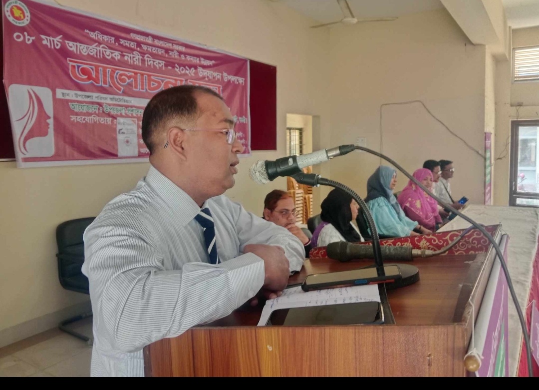 আসুন নিজ পরিবার থেকে সকল ক্ষেত্রে নারীদের বৈষম্য প্রতিরোধে সোচ্চার হই এবং নারী মর্যাদা ও অধিকার রক্ষার্থে গুরুত্বপূর্ণ ভূমিকা পালন করি। শুধু দিবস পালনের মাধ্যম দিয়েই নারীর মর্যাদা রক্ষা করা সম্ভব নয়। এর জন্য প্রযোজন আত্নসচেতনতা, দায়িত্ববোধ এবং দৃষ্টিভঙ্গির ইতিবাচক পরিবর্তন।” আলোচনা সভায় আরোও উপস্থিত ছিলেন উপজেলা প্রশাসনের বিভিন্ন দপ্তরের প্রতিনিধিবৃন্দ, এনজিও, বিভিন্ন নারী সংগঠন, পেশাজীবী সংগঠন, স্থানীয় সরকার এবং প্রিন্ট ও ইলেকট্রনিক মিডিয়ার প্রতিনিধিবৃন্দ।