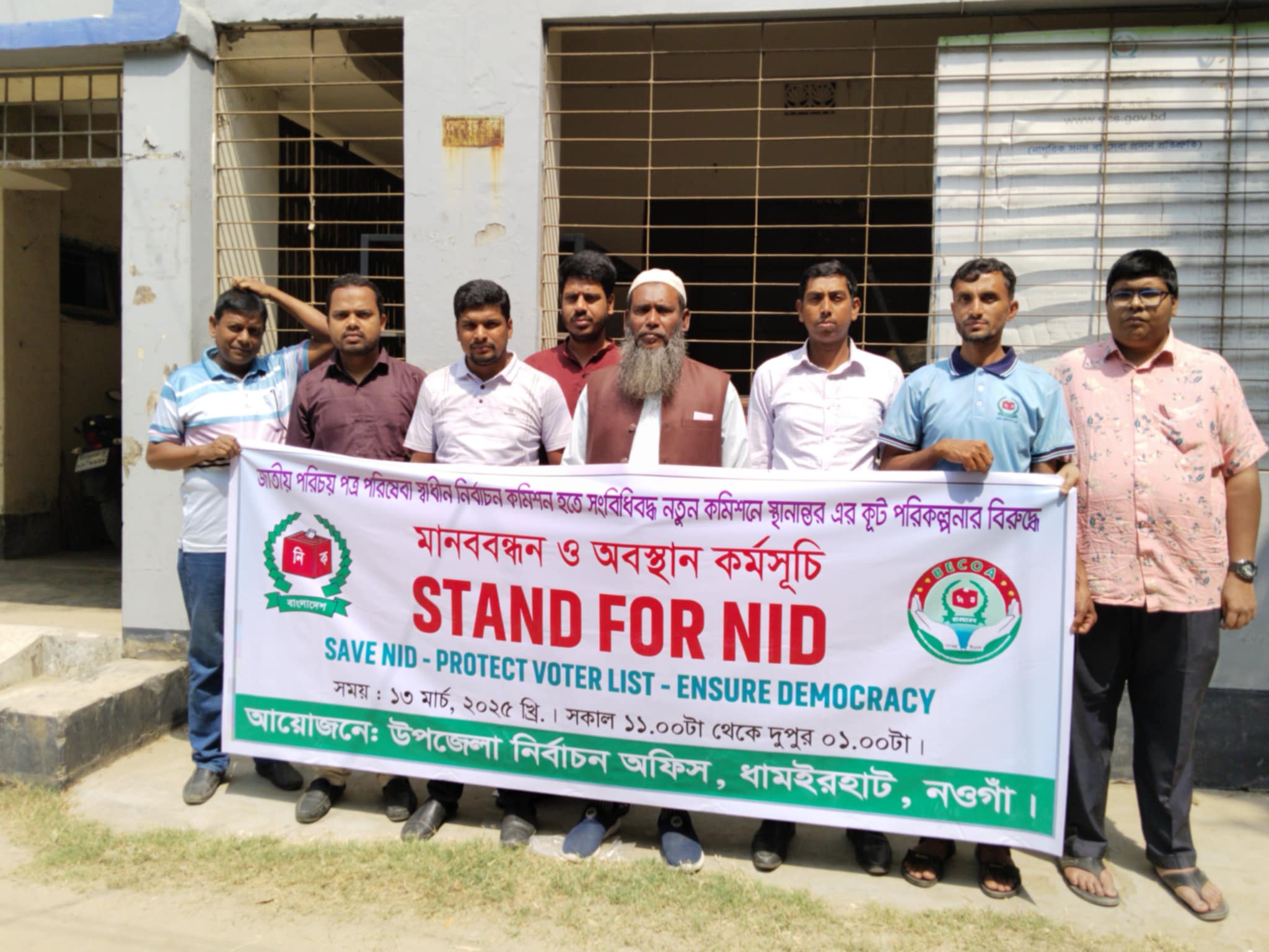 মাসুদ সরকার, ধামইরহাট (নওগাঁ) প্রতিনিধিঃ ধামইরহাট উপজেলা নির্বাচন অফিসের কর্মকর্তা কর্মচারীদের অংশগ্রহণে মানববন্ধন অনুষ্ঠিত হয়েছে। সারাদেশের ন্যায় ধামইরহাট উপজেলা নির্বাচন অফিসের আয়োজনে জাতীয় পরিচয় পত্র পরিষেবা স্বাধীন নির্বাচন কমিশন হতে সংবিধিবদ্ধ নতুন কমিশনে স্থানান্তরের কুট পরিকল্পনার বিরুদ্ধে মানববন্ধন ও অবস্থান কর্মসূচি (STAND FOR NID)  অনুষ্ঠিত হয়েছে।