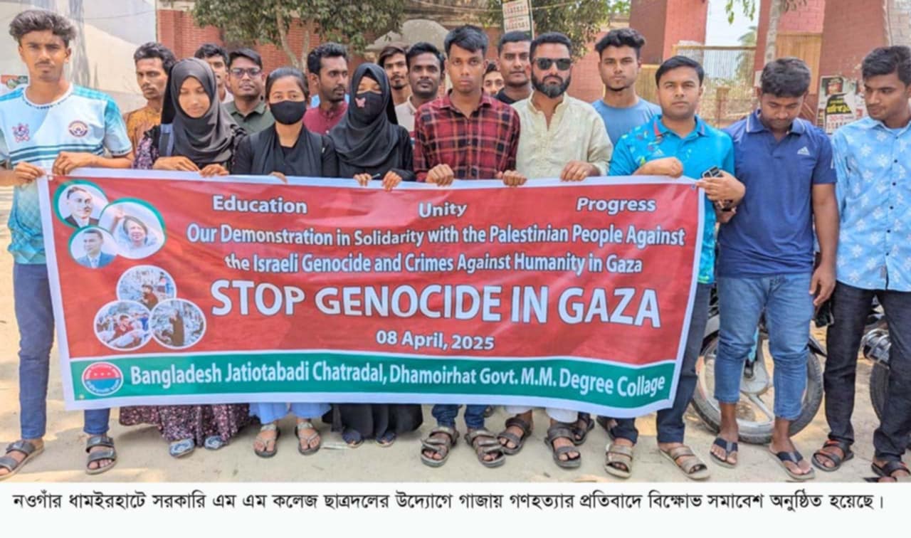 নওগাঁর ধামইরহাটে ফিলিস্তিনি ও গাজায় ইসরাইলী হামলা ও গণহত্যার প্রতিবাদে বিক্ষোভ সমাবেশ করেছে ধামইরহাট এম এম সরকারি ডিগ্রি কলেজ শাখার ছাত্রদল।