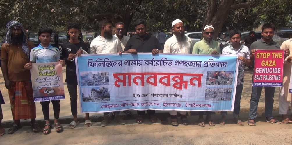 গাজায় ইসরায়েলী গণহত্যার প্রতিবাদে চাঁপাইনবাবগঞ্জে মানববন্ধন ও প্রতিবাদ সমাবেশ