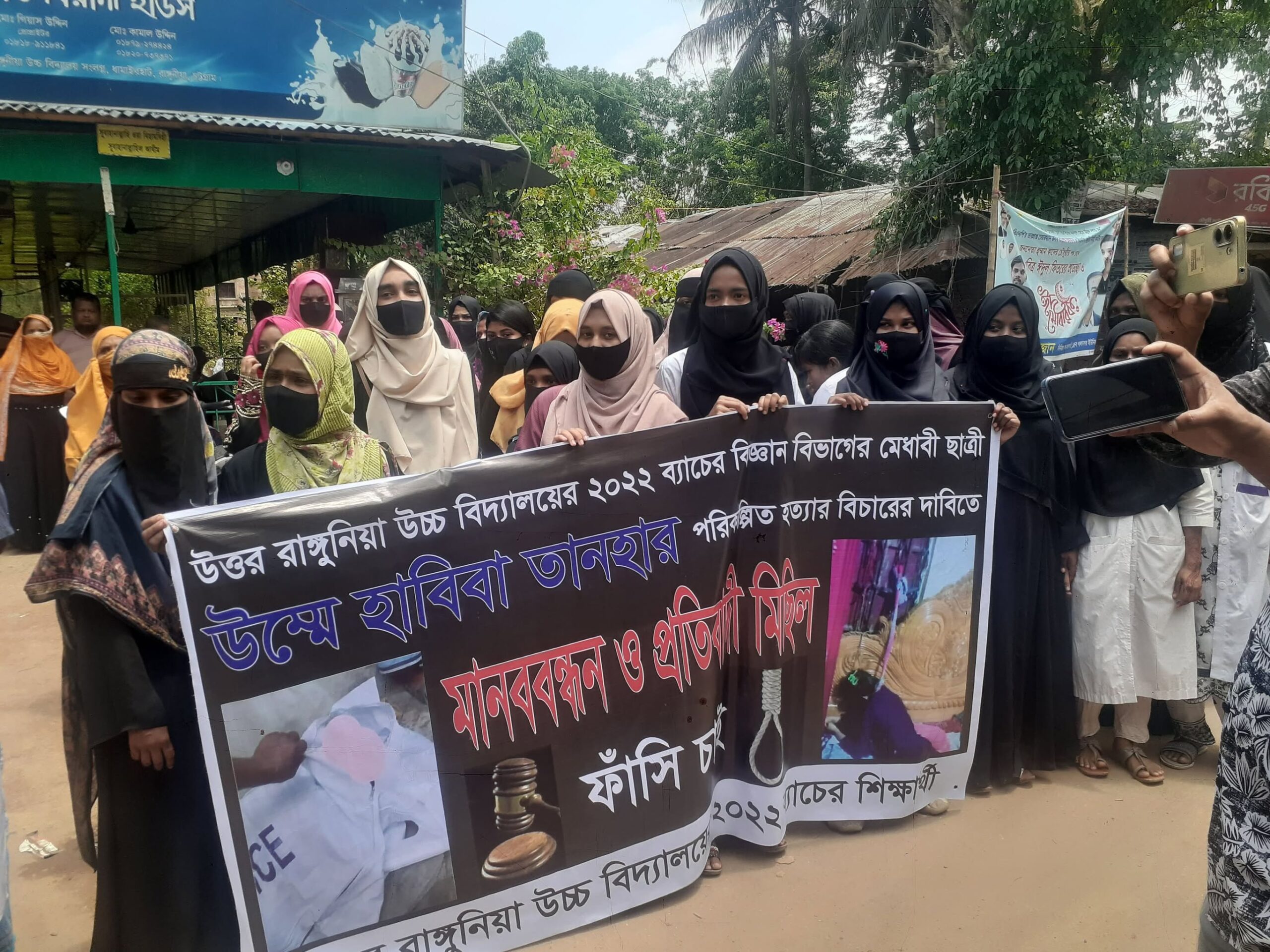ছবির ক্যাপশন: রাঙ্গুনিয়ায় সহপাঠী হত্যার দাবী করে মানববন্ধন ও বিক্ষোভ করেছে সহপাঠীরা।