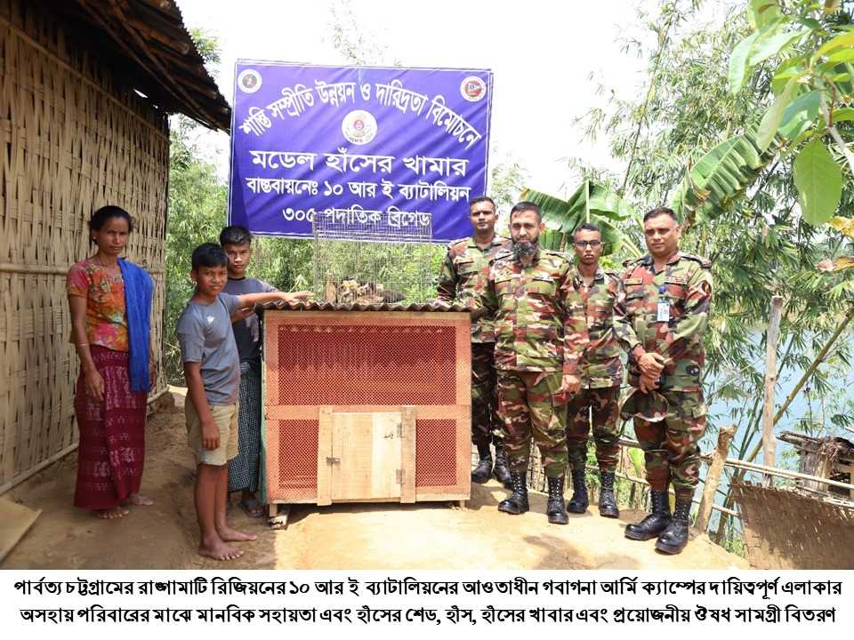 কাপ্তাই প্রতিনিধি:- কাপ্তাই ১০ আর ই ব্যাটালিয়ন কর্তৃক অসহায় পরিবারের মাঝে মানবিক সহায়তা এবং হাঁসের শেড, হাঁস, হাঁসের খাবার এবং প্রয়োজনীয় ঔষধ সামগ্রী বিতরণ করা হয়েছে। বৃহস্পতিবার (১৭ এপ্রিল) রাঙ্গামাটি রিজিয়নের কাপ্তাই উপজেলার ১০ আর ই ব্যাটালিয়ন এর দায়িত্বপূর্ণ এলাকায় এগুলো বিতরণ করা হয়।