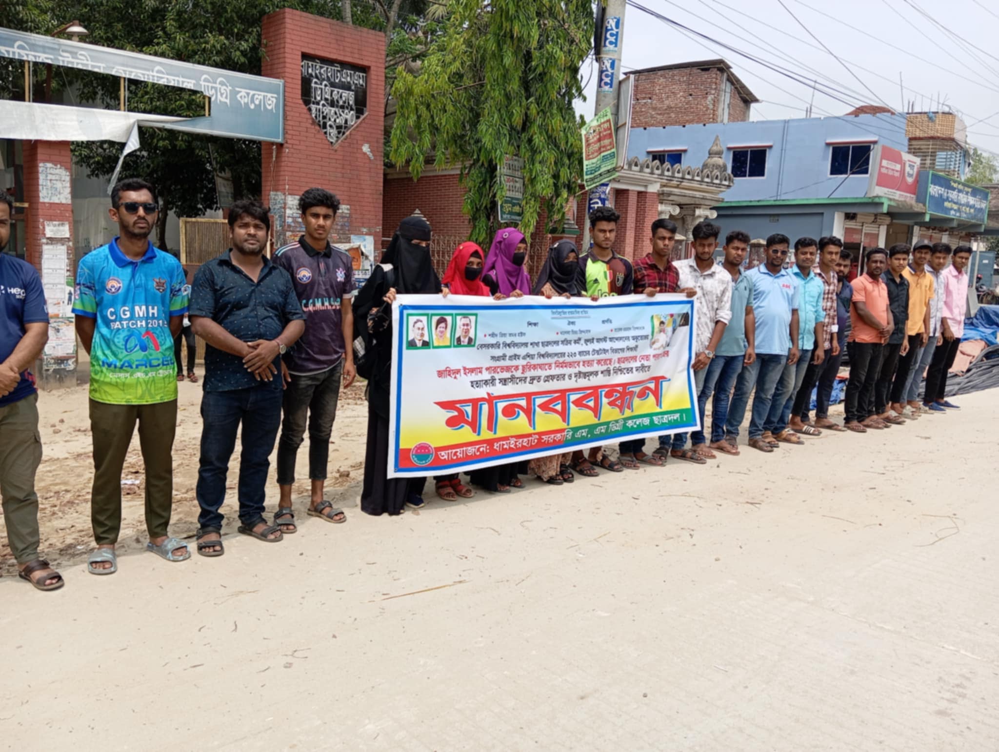 ধামইরহাট সরকারি এমএম ডিগ্রী কলেজ শাখা ছাত্রদলের আয়োজনে বে-সরকারি বিশ্ববিদ্যালয় শাখা ছাত্রদলের সক্রিয় কর্মী এবং জুলাই-আগস্ট আন্দোলনের অকুতোভয় সংগ্রামী প্রাইম এশিয়া বিশ্ববিদ্যালয়ের টেক্সটাইল বিভাগের শিক্ষার্থী জাহিদুল ইসলাম পারভেজ কে ছুরিকাঘাত করে নির্মম ভাবে হত্যা করার প্রতিবাদে ধামইরহাটে মানববন্ধন কর্মসূচি অনুষ্ঠিত হয়েছে।