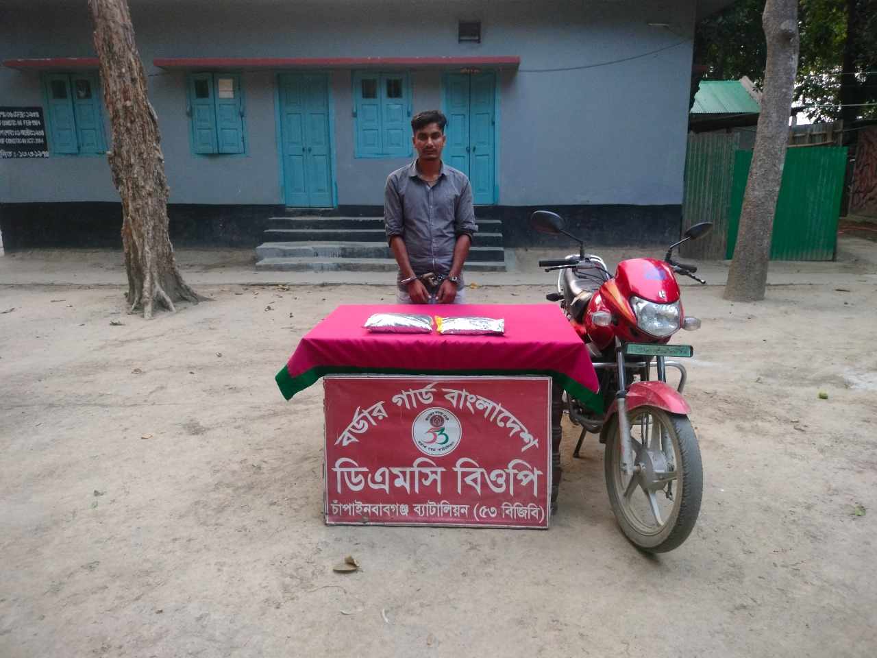 প্রেস বিজ্ঞপ্তিতে বলা হয় চাঁপাইনবাবগঞ্জ ব্যাটালিয়ন ৫৩ বিজিবির ডিএমসি বিওপির একটি টহলদল রাজশাহী জেলার গোদাগাড়ী থানাধীন আষাড়িয়াদহ ইউনিয়নের চরভূবনপাড়া গ্রামে টহল পরিচালনা করার সময় গোপন সংবাদের ভিত্তিতে জানতে পারে ঈদগাহ মোড় এলাকা দিয়ে মোটরসাইকেলযোগে মাদক চোরাচালান হওয়ার সম্ভাবনা রয়েছে। টহলদল উক্ত স্থানে গোপনে নজর রাখতে শুরু করে। আনুমানিক সাড়ে পাঁচটার দিকে সন্দেহজনক ০১টি মোটরসাইকেলযোগে ০২ জন ব্যক্তিকে আসতে দেখে। টহলদল তাদের থামার সংকেত দিলে তারা মোটরসাইকেল ফেলে দৌড়ে পালানোর চেষ্টা করে। তৎক্ষণাৎ টহলদল ধাওয়া করে উক্ত মোটরসাইকেল ০১ জন আরোহীকে আটক করতে সক্ষম হয়। পরবর্তীতে টহলদল আটককৃত ব্যক্তির মোটরসাইকেলে থাকা ব্যাগটি তল্লাশী করে ০২ কেজি ভারতীয় হেরোইন পাওয়া যায়।