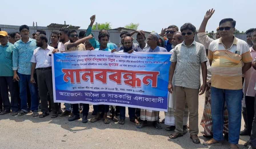 চাঁপাইনবাবগঞ্জ জেলার গোমস্তাপুর উপজেলার রহনপুর ইউনিয়নের মচকৈল মোড়ে গোমস্তাপুর উপজেলা শ্রমিক লীগের সদস্য সজীব মোঃ জুবায়ের আহমেদ ও চাঁপাইনবাবগঞ্জ জেলা আওয়ামীলীগের কার্যনির্বাহী সদস্য হাসান রশিদুজ্জামান বিপ্লব এবং তাদের সাঙ্গপাঙ্গের বিরুদ্ধে একাধিক মামলা ও থানায় অভিযোগ করেও কোন প্রকার সুরাহা না পেয়ে এই মানববন্ধন ও বিক্ষোভ মিছিল করেছেন ভুক্তভোগী ও এলাকাবাসীরা।