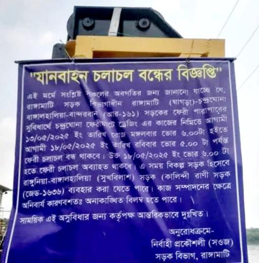 ড্রেজিং কাজের জন্য  আগামী ১৩ মে (মঙ্গলবার) ভোর ৬ টা থেকে ১৮ মে (রবিবার) পর্যন্ত চন্দ্রঘোনা – রাইখালী নৌ রুটে  ফেরি চলাচল  বন্ধ থাকবে।