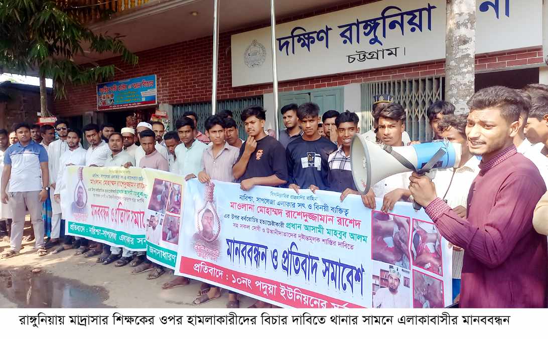 রাঙ্গুনিয়া প্রতিনিধি:রাঙ্গুনিয়ায় মাওলানা রাশেদুজ্জামান (২৮) নামে এক মাদ্রাসা শিক্ষকের ওপর হামলার ঘটনায় এলাকার জনসাধারণ মানববন্ধন, বিক্ষোভ মিছিল ও সমাবেশ করেছে। শুক্রবার (৯ মে) দুপুরে পদুয়া ইউনিয়নের দক্ষিণ রাঙ্গুনিয়া থানার সামনে এই বিক্ষোভ কর্মসূচি অনুষ্ঠিত হয়। পদুয়া নারিশ্চা সাপলেজাপাড়া এলাকাবাসীর ব্যানারে নারিশ্চা বটতল এলাকা থেকে বিক্ষোভ মিছিল নিয়ে দক্ষিণ রাঙ্গুনিয়া থানা পর্যন্ত প্রদক্ষিণ করে।