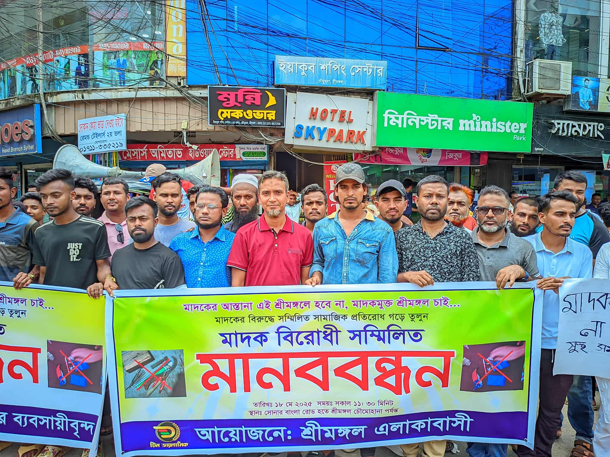 সমাবেশে বক্তারা বলেন, শ্রীমঙ্গল শহরের শাপলাবাগ রেল কলোনী, সোনার বাংলা রোড, আরামবাগ, দক্ষিণ ভাড়াউড়াসহ উপজেলার বিভিন্ন স্থানে দীর্ঘদিন যাবত প্রকাশ্যে মাদক-ইয়াবা বেচাকেনা এবং পতিতাতের আনাগোনা লক্ষ করা গেছে। ইতোমধ্যে স্থানীয় এলাকাবাসি এবং যুবকদের সহায়তায় শাপলাবাগ এলাকার মাদক ব্যবসায়ি শাহিদা বেগম এবং সোনার বাংলা রোডের মাদক সম্রাট স্বপন এবং বীরঙ্গনা আনোয়ারা বেগমের বসতঘর থেকে পুলিশ অভিযান চালিয়ে মাদক-ইয়াবা বিক্রির নগদ কয়েক লাখ টাকা, ইয়াবা এবং দেশীয় অস্ত্র করেছে। কিন্তু মাদকের গডফাদার স্বপন গং এবং পতিতার গড ফাদারকে গ্রেফতার করতে পারেনি। বিভিন্ন সময় স্থানীয়রা মাদকসেবিদের মাদক ইয়াবাসহ আটক করে পুলিশকে খবর দিয়ে পুলিশ নারাজ হয়। এলাকাবাসি পুলিশকে সাথে নিয়ে মাঝেমধ্যে মাদক-পতিতার আস্তানায় অভিযান চালানোর আগ্রহ প্রকাশ করলে পুলিশ আসতে অনাগ্রহ প্রকাশ করে বা আসতে কালবিলম্ব করে। এছাড়া এলাকাবাসি হাতেনাতে অপরাধীদের পুলিশের হাতে তুলে দিলে কিছুদিন পর তারা জামিনে বেরিয়ে এসে প্রতিবাদকারীদের উলটো হুমকি ও নানাভাবে হেনস্তা করে। দীর্ঘদিন যাবত প্রকাশ্যে মাদক ও পতিতার ব্যবসা চালিয়ে গেলেও প্রশাসন তাদের উচ্ছেদ করছে না; মাদক ব্যবসায়ী ও পতিতাদের ক্ষমতার খুটির জোর কোথায় আমরা জানতে চাই! মানববন্ধন থেকে প্রশাসনকে জানাতে চাই, দ্রæত শহরের চিহ্নিত পতিতা ও মাদকের সকল আস্তানা উচ্ছেদ করে মাদক কেনাবেচা বন্ধে কঠোর পদক্ষেপ নিন। ন অন্যথায় বৃহত্তর আন্দোলনের হুঁশিয়ারি দেন মানববন্ধনকারীরা।