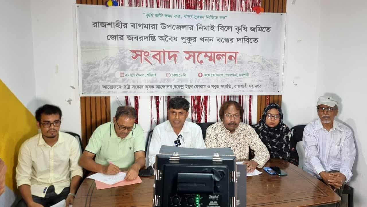 সংবাদ সম্মেলন থেকে জানানো হয়েছে, রাজশাহীর বিভিন্ন উপজেলার পাশাপাশি বাগমারা উপজেলার নিমাই বিলের কৃষিজমিতে জোর জবরদস্তি অবৈধ পুকুর খননের মহোৎসব চলছে। কৃষি জমি রক্ষায় এ বিষয়টি নিয়ে ৪/৫ মাস যাবৎ প্রশাসনের দৃষ্টিতে আনার জন্য মানববন্ধন, স্মারকলিপি প্রদান করা হয়েছে। এর পরেও কোন প্রতিকার না পেয়ে গত- ১৯ মার্চ ২০২৫ তারিখে “বিজ্ঞ রাজশাহী সিনিয়র জুডিশিয়াল ম্যাজিস্ট্রেট বাগমারা আমলী”- আদালতে একটি মামলা করা হয়। মামলা নম্বর: সি.আর কেস নং-৩৪৭/২০২৫ (বাগমারা)। বাগমারা উপজেলার এসি-ল্যান্ড বরাবর মামলাটির তদন্তভার রয়েছে। একই বিষয়ে কোন অগ্রগতি না ঘটলে গত ৮ এপ্রিল ২০২৫ তারিখে মহামান্য হাইকোর্ট বিভাগে একটি রিট-পিটিশন দেওয়া হয় এবং এই রিটে বাগমারা উপজেলায় পুকুর খননে স্থগিতাদেশ সহ রাজশাহী জেলা প্রশাসক, ইউএনও, এসি-ল্যান্ড কে কার্যকর পদক্ষেপ গ্রহণে নির্দেশনা প্রদান করা হয়।