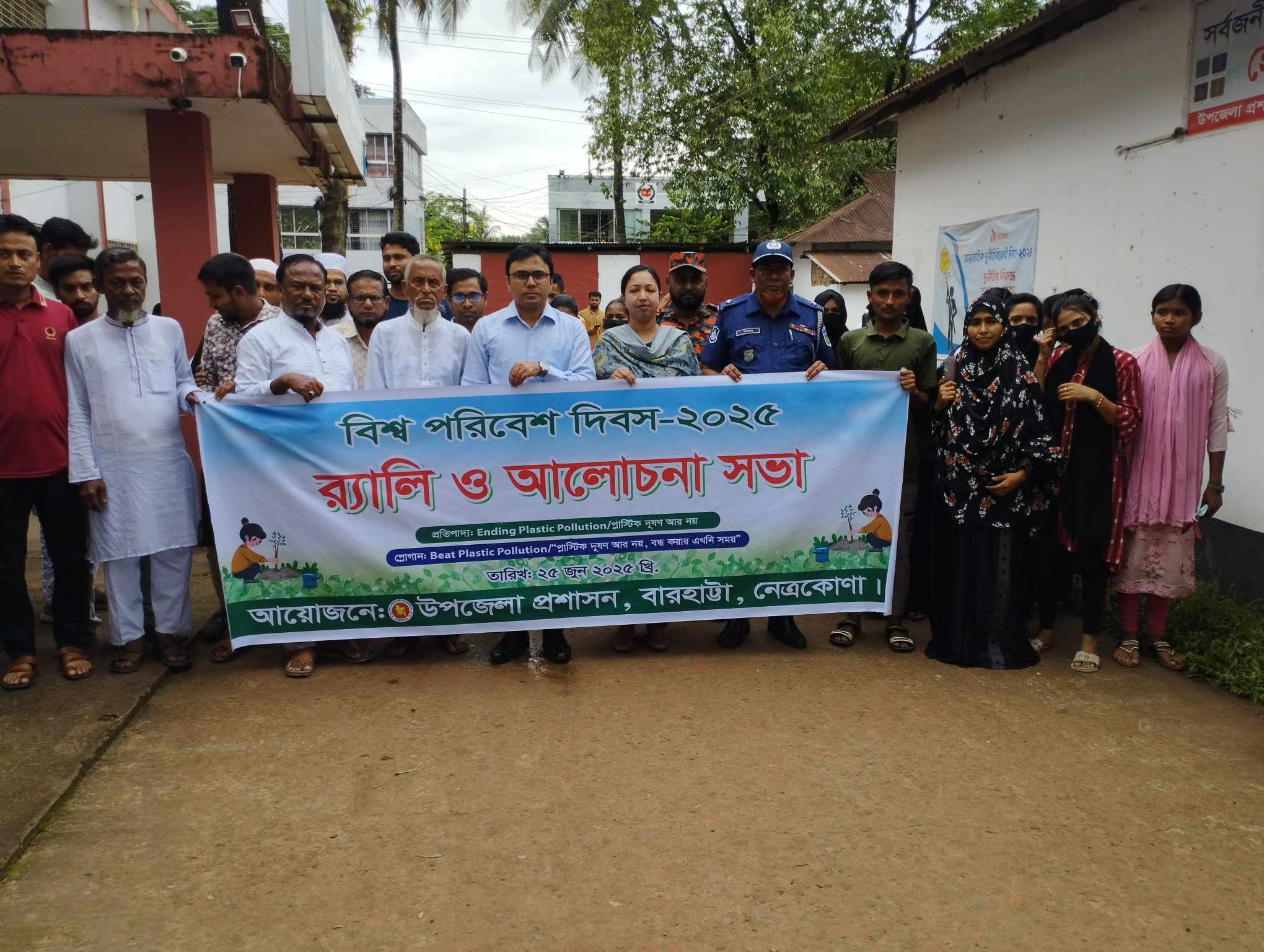 মামুন কৌশিক, নেত্রকোনা প্রতিনিধিঃ “প্লাস্টিক দূষণ আর নয়, বন্ধ করার এখনই সময়”—এই স্লোগান কে সামনে রেখে নেত্রকোনার বারহাট্টায় পালিত হয়েছে বিশ্ব পরিবেশ দিবস-২০২৫।বুধবার (২৫ জুন) বেলা ১১টায় বারহাট্টা উপজেলা প্রশাসনের উদ্দ্যোগে দিবসটি উপলক্ষে একটি বর্ণাঢ্য র‍্যালি, আলোচনা সভা ও বৃক্ষরোপণ কর্মসূচি পালিত হয়। র‍্যালিটি উপজেলা প্রাঙ্গণ থেকে শুরু হয়ে শহরের গুরুত্বপূর্ণ সড়ক প্রদক্ষিণ করে পুনরায় উপজেলা প্রাঙ্গণে এসে শেষ হয়।