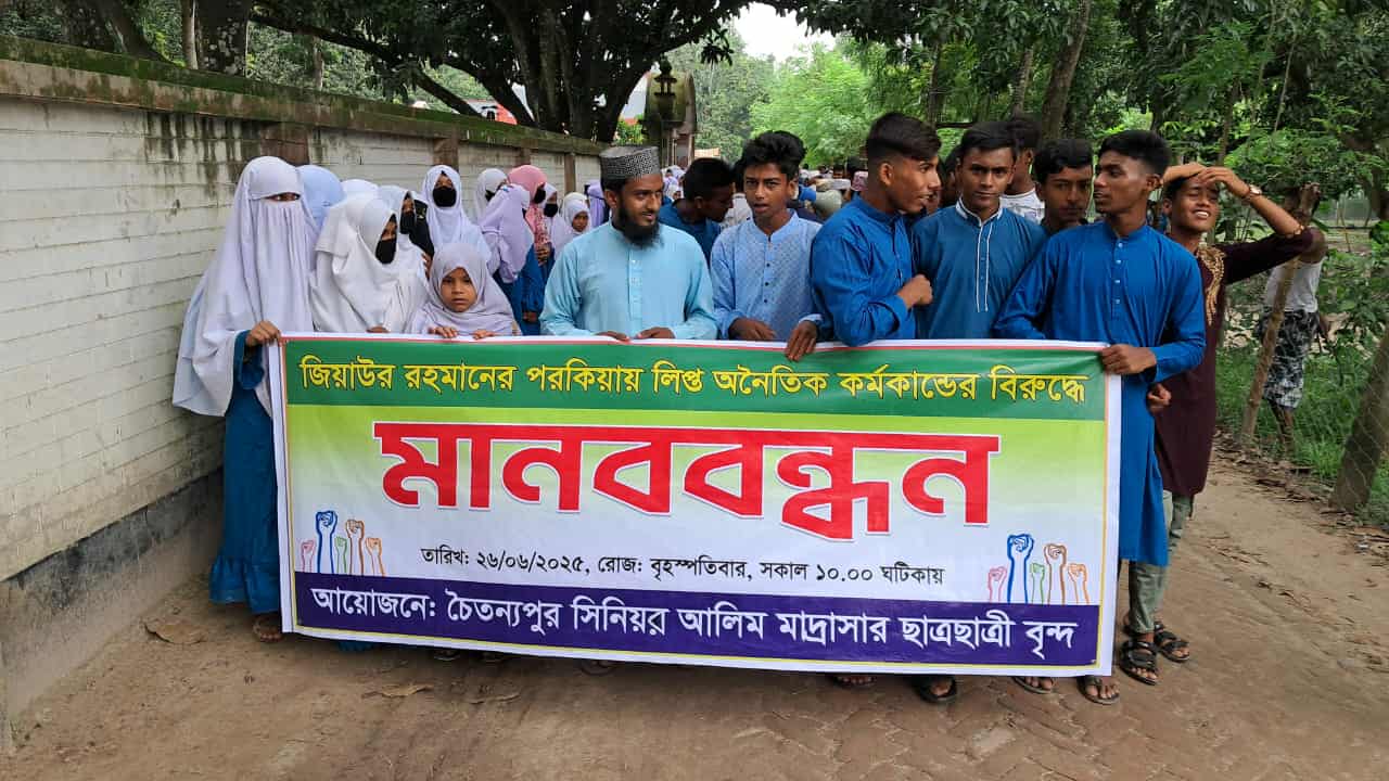 মোঃ নাসিম চাঁপাইনবাবগঞ্জ প্রতিনিধিঃচাঁপাইনবাবগঞ্জে বৃহস্পতিবার (২৬ জুন) সকালে চৈতন্যপুর সিনিয়র আলিম মাদ্রাসার সহকারী শারিরীক শিক্ষার শিক্ষক জিয়াউর রহমানের পরকিয়ায় লিপ্ত ও অনৈতিক কর্মকান্ডের সাথে জড়িত হওয়ায় তার বিরুদ্ধে মানববন্ধন করেছে উক্ত মাদ্রাসা শিক্ষার্থীরা।