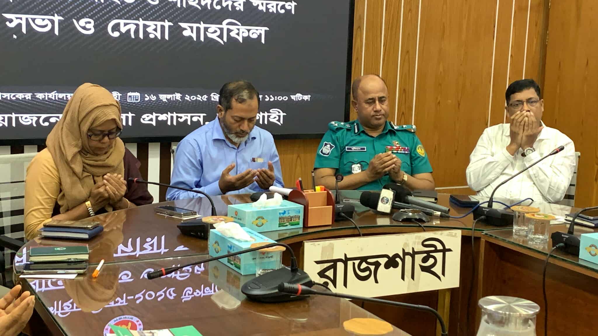 আজ জুলাই শহীদ দিবসে উপলক্ষে রাজশাহী জেলা প্রশাসনের স্মরণসভা ও দোয়া মাহফিল