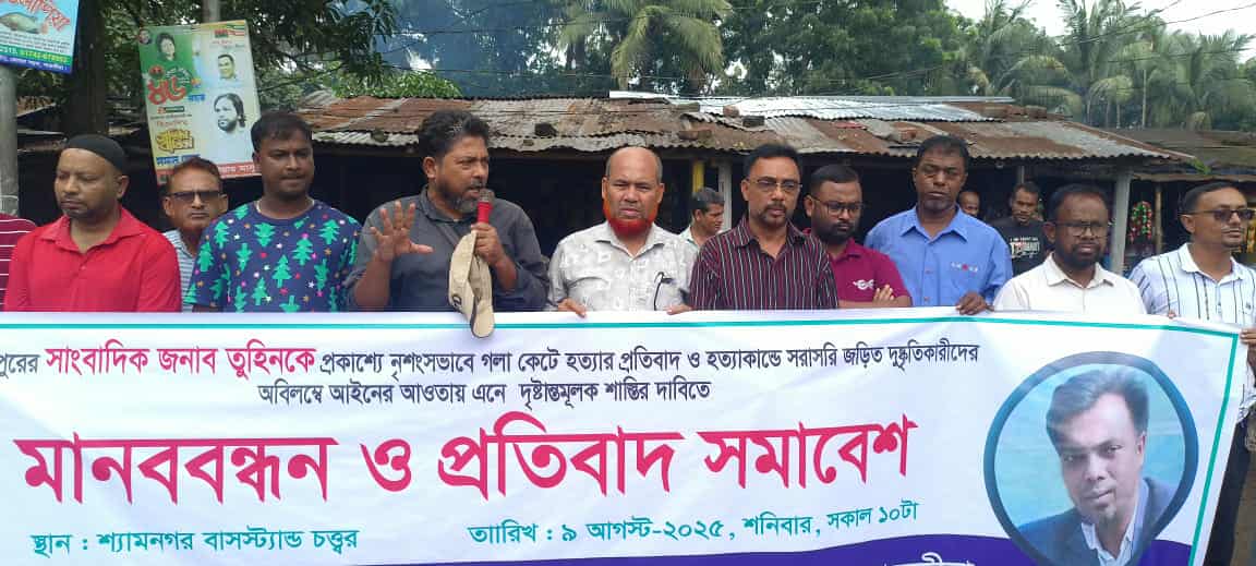 শ্যামনগর উপজেলা প্রেসক্লাবের উদ্যোগে সাংবাদিক তুহিনকে কুপিয়ে হত্যার প্রতিবাদে মানববন্ধন
