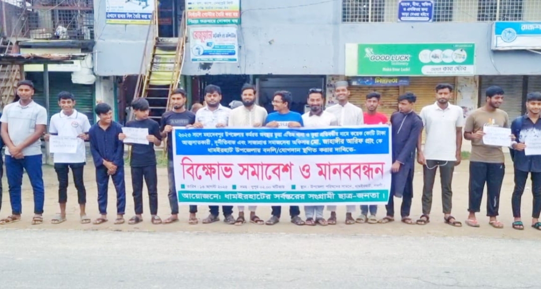 ধামইরহাটে দুর্নীতিগ্রস্ত সমাজসেবা কর্মকর্তার যোগদান ঠেকাতে ছাত্র-জনতার মানববন্ধন