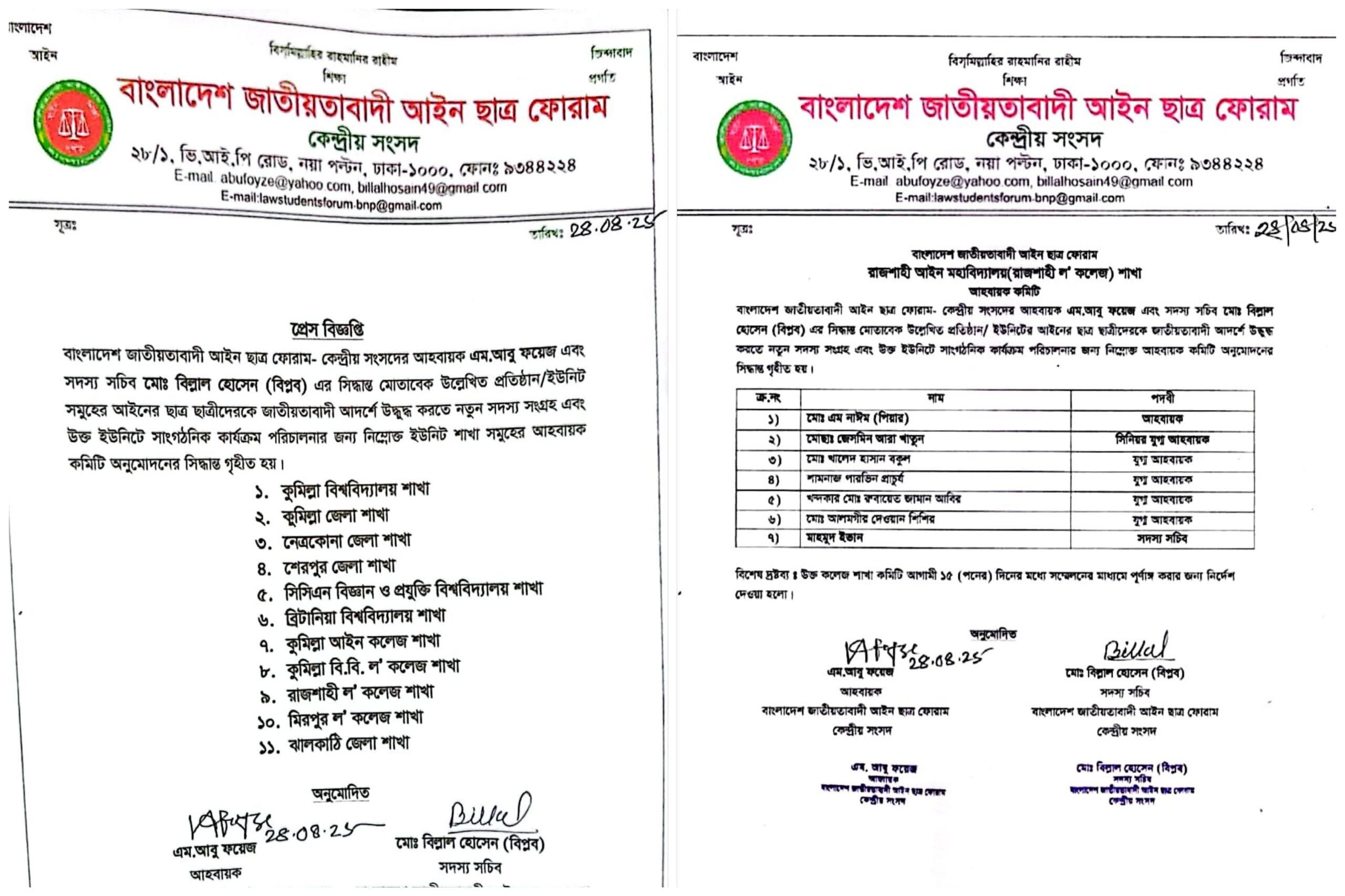 রাজশাহী : বিগত ২৮ আগস্ট ২০২৫ ইং তারিখে, বাংলাদেশের আইন অধ্যায়নরত শিক্ষার্থীদের সর্ববৃহৎ জনপ্রিয় সংগঠন বাংলাদেশ জাতীয়তাবাদী আইন ছাত্র ফোরামের কেন্দ্রীয় সংসদের আহবায়ক এম.আবু ফয়েজ এবং সদস্য সচিব মোঃ বিল্লাল হোসেন (বিপ্লব) এর সিদ্ধান্ত মোতাবেক রাজশাহী আইন মহাবিদ্যালয় (রাজশাহী ল’কলেজ) আইনের ছাত্র ছাত্রীদেরকে জাতীয়তাবাদী আদর্শে উদ্বুদ্ধ করতে নতুন সদস্য সংগ্রহ এবং উক্ত ইউনিটে সাংগঠনিক কার্যক্রম পরিচালনার জন্য প্রাথমিকভাবে ৭ সদস্য বিশিষ্ট আহ্বায়ক কমিটি অনুমোদন দেয়া হয়েছে।