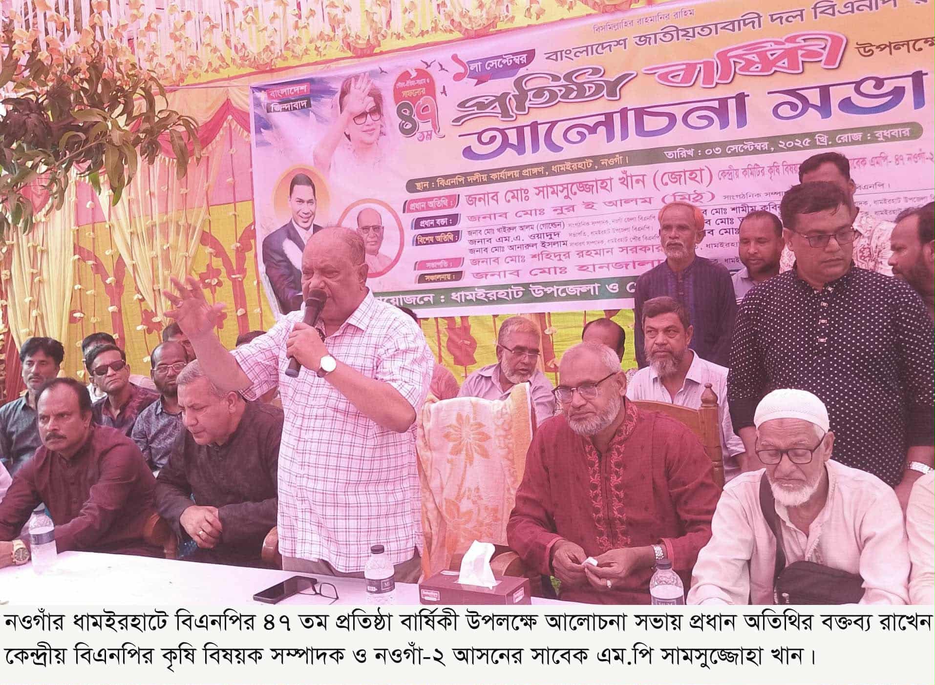 বিএনপির ৪৭ তম প্রতিষ্ঠা বার্ষিকী উপলক্ষে ৩ সেপ্টেম্বর দুপুর ১২ টায় দলীয় কার্যালয়ের সামনে আলোচনা সভায় প্রধান অতিথির বক্তব্যে বিএনপি’র কেন্দ্রীয় কৃষি বিষয়ক সম্পাদক ও সাবেক সংসদ সদস্য সামসুজ্জোহা খান উপরোক্ত কথাগুলো বলেন।