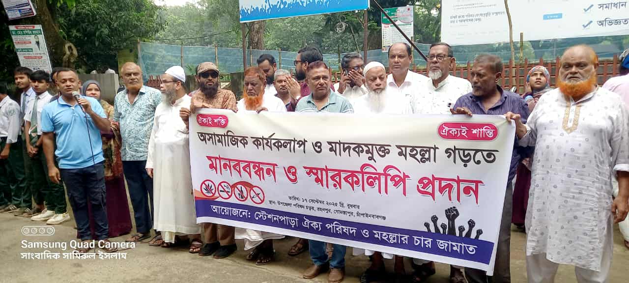 চাঁপাইনবাবগঞ্জ গোমস্তাপুরে অসামাজিক কার্যকলাপ প্রতিরোধ ও মাদকমুক্ত মহল্লা গড়তে মানববন্ধন