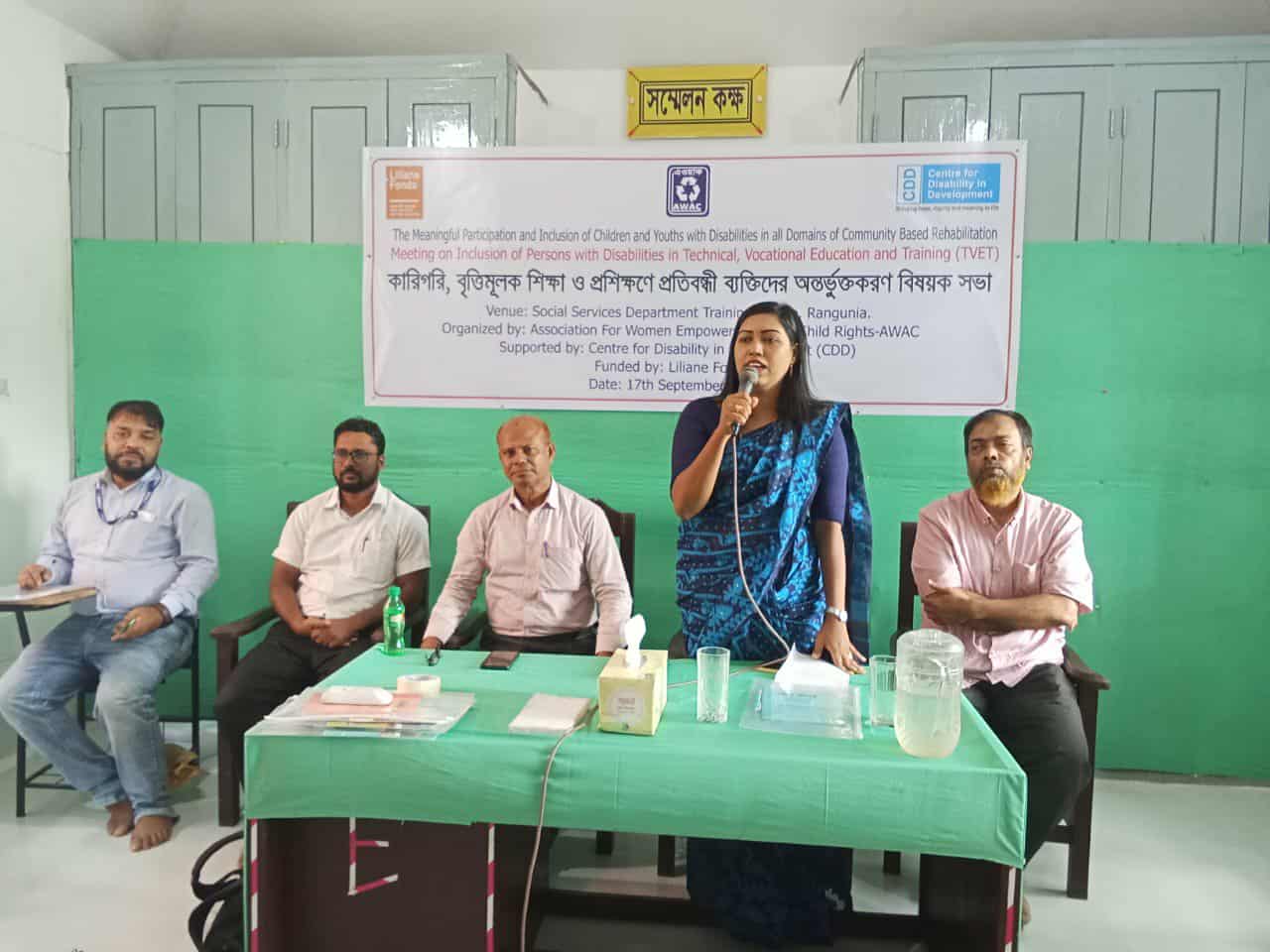 রাঙ্গুনিয়া প্রতিনিধি:রাঙ্গুনিয়ায় কারিগরী বৃত্তিমূলক শিক্ষা ও প্রশিক্ষণে প্রতিবন্ধী ব্যক্তিদের অন্তর্ভক্তকরণ বিষয়ক সভা দাতা সংস্থা লিলিয়ানা ফন্টস ও বাংলাদেশের কান্ট্রি গ্রান্ড ম্যানেজার সেন্টার ফর ডিজিএ্যাবিলিটি ইন ডেভেলপমেন্ট (সিডিডি) ‘এর কারিগরী সহায়তায় ও স্থানীয় উন্নয়ন সংস্থা এ্যাসোসিয়েশন ফর উইমেন ইমম্পাউয়ারমেন্ট এন্ড চাইল্ড রাইটস -এওয়াকের সহায়তায় বুধবার (১৭ সেপ্টেম্বর) দুপুরে অনুষ্ঠিত হয়েছে। সমাজসেবা অধিদপ্তরের রাঙ্গুনিয়ার জিয়ানগরের এতিম ও দুস্থ শিশুদের বৃত্তিমূলক প্রশিক্ষণ কেন্দ্রের হলরুমে এই প্রশিক্ষণ কর্মশালা অনুষ্ঠিত হয়।