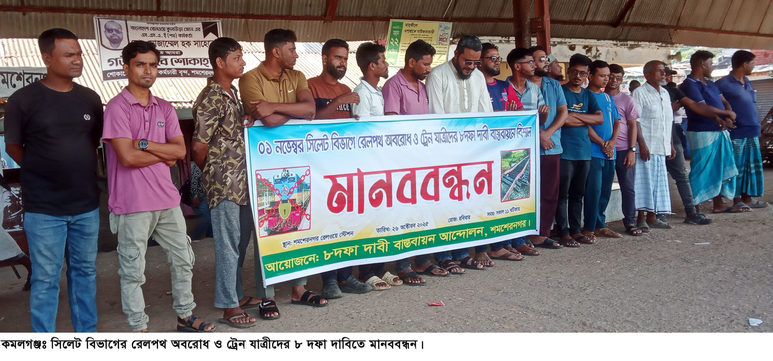 শমশেরনগরে মানববন্ধন ও বিক্ষোভ: ১ নভেম্বর সিলেট বিভাগে রেলপথ অবরোধের ঘোষণা