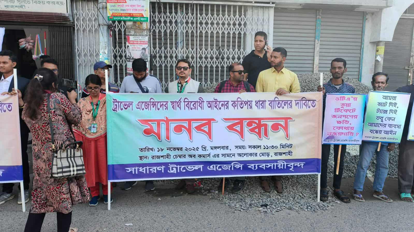 ট্রাভেল এজেন্সির বিরুদ্ধে বৈরী আইনের ধারা বাতিলের দাবিতে রাজশাহীতে মানববন্ধন