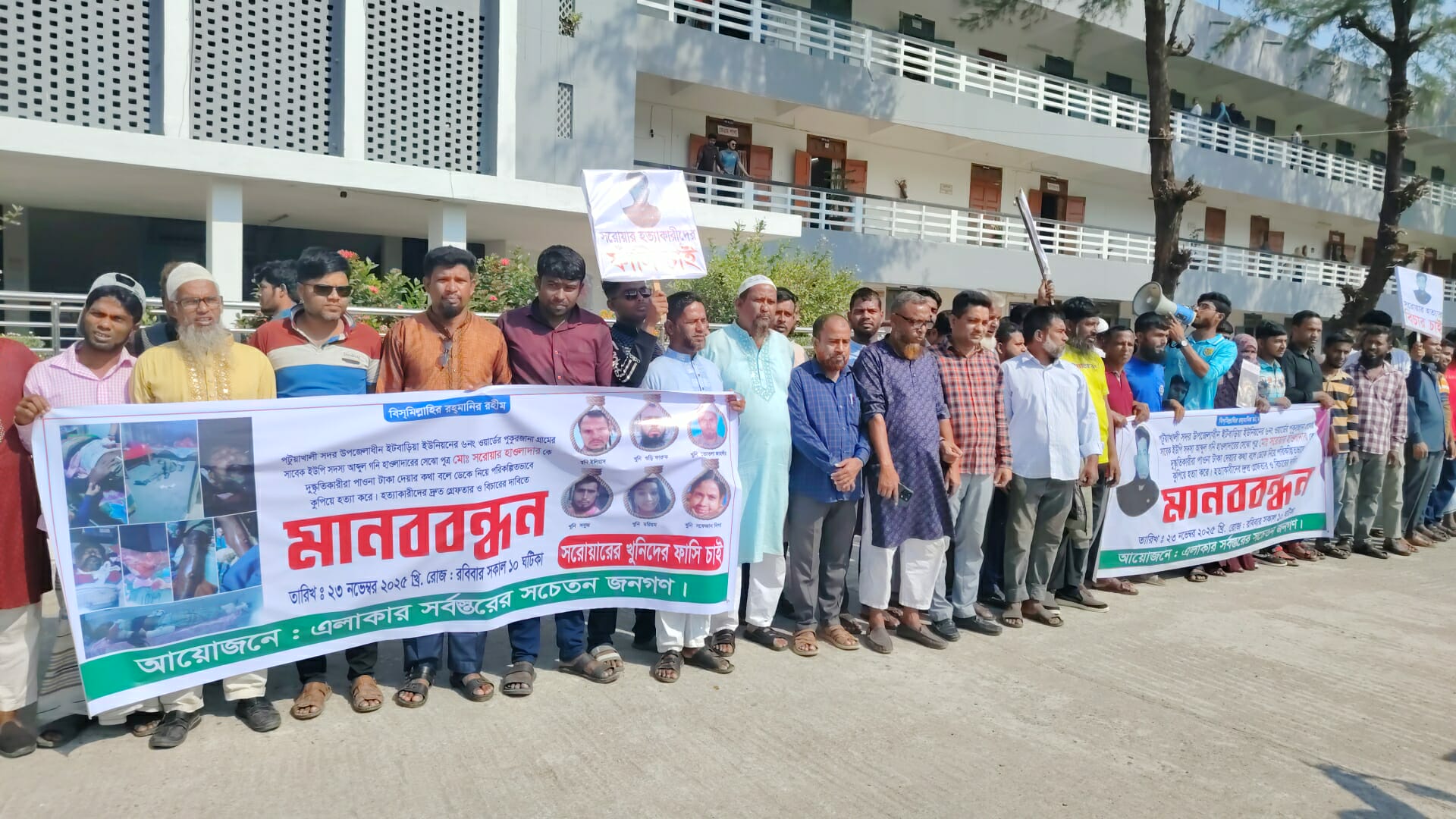 পটুয়াখালীর ইটবাড়িয়া সাবেক ইউপি সদস্য সরোয়ার হত্যার বিচারের দাবিতে মানববন্ধন
