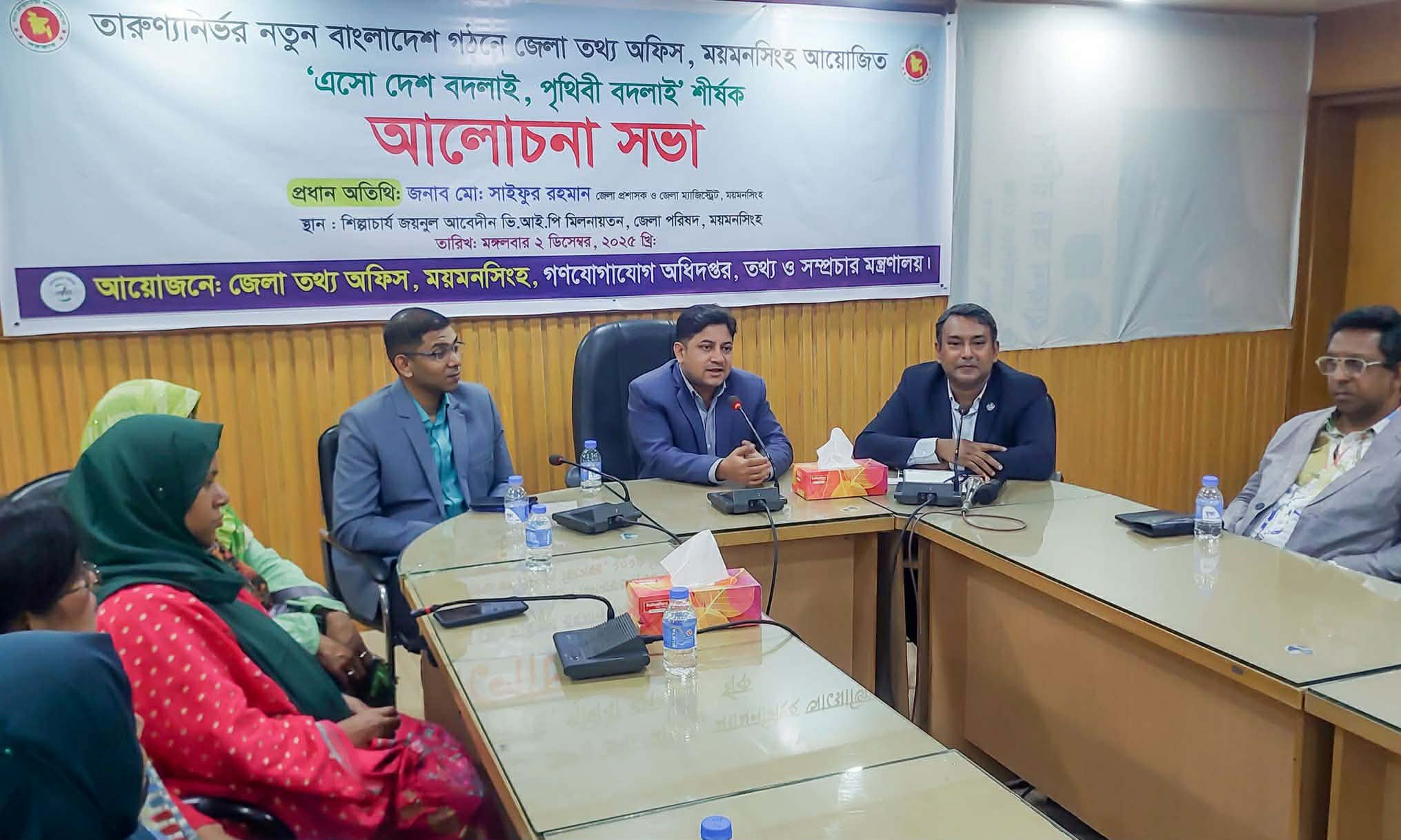 আরিফ রববানী ময়মনসিংহ:তারুণ্যনির্ভর নতুন বাংলাদেশ গঠনে জেলা তথ্য অফিস, ময়মনসিংহের আয়োজনে ‘এসো দেশ বদলাই, পৃথিবী বদলাই’ শীর্ষক আলোচনা সভা অনুষ্ঠিত হয়েছে।
