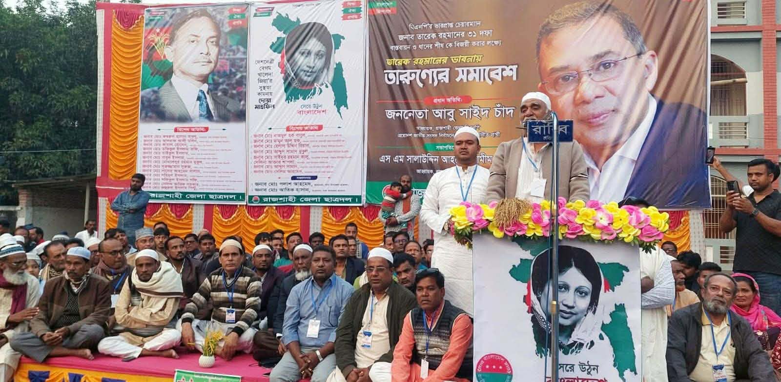 দোয়া মাহফিল ও তারুণ্যের সমাবেশে রাজশাহী জেলা ছাত্রদলের আহবায়ক এস এম সালাউদ্দিন আহমেদ শামিম সরকারের সভাপতিত্বে প্রধান অতিথি হিসেবে উপস্থিত ছিলেন কেন্দ্রীয় কমিটির সিনিয়র সদস্য, রাজশাহী জেলা বিএনপির আহবায়ক ও রাজশাহী-৬ (চারঘাট-বাঘা) আসনের দলীয় প্রার্থী আবু সাঈদ চাঁদ।