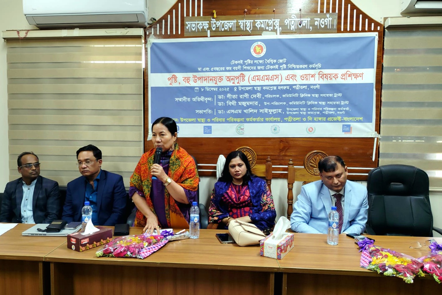 সোমবার উপজেলা স্বাস্থ্য ও পরিবার পরিকল্পনা কর্মকর্তার কার্যালয় ও দি হাঙ্গার প্রজেক্ট-বাংলাদেশের আয়োজনে সিএইচসিপি, সেকমো, এফডব্লিউভিদের নিয়ে এ প্রশিক্ষণ অনুষ্ঠানে উপজেলা স্বাস্থ্য ও পরিবার পরিকল্পনা কর্মকর্তা ডাঃ এসএম খালিদ সাইফুল্লাহ্ এর সভাপতিত্বে প্রশিক্ষণ সহায়ক হিসেবে উপস্থিত ছিলেন কমিউনিটি ক্লিনিক স্বাস্থ্য সহায়তা ট্রাস্ট এর ডাঃ গীতা রাণী দেবী, ডাঃ বিথী মজুমদার, দি হাঙ্গার প্রজেক্টের টেকসই পুষ্টির লক্ষে বৈশ্বিক জোট কর্মসুচির টেকনিক্যাল এক্সপার্ট ডাঃ সুবীর খিয়াং বাবু, পত্নীতলা স্বাস্থ্য কেন্দ্রের আবাসিক মেডিকেল অফিসার ডাঃ দেবাশীষ রায়, দি হাঙ্গার প্রজেক্টের এলাকা সমন্বয়কারী আসির উদ্দীন প্রমুখ।