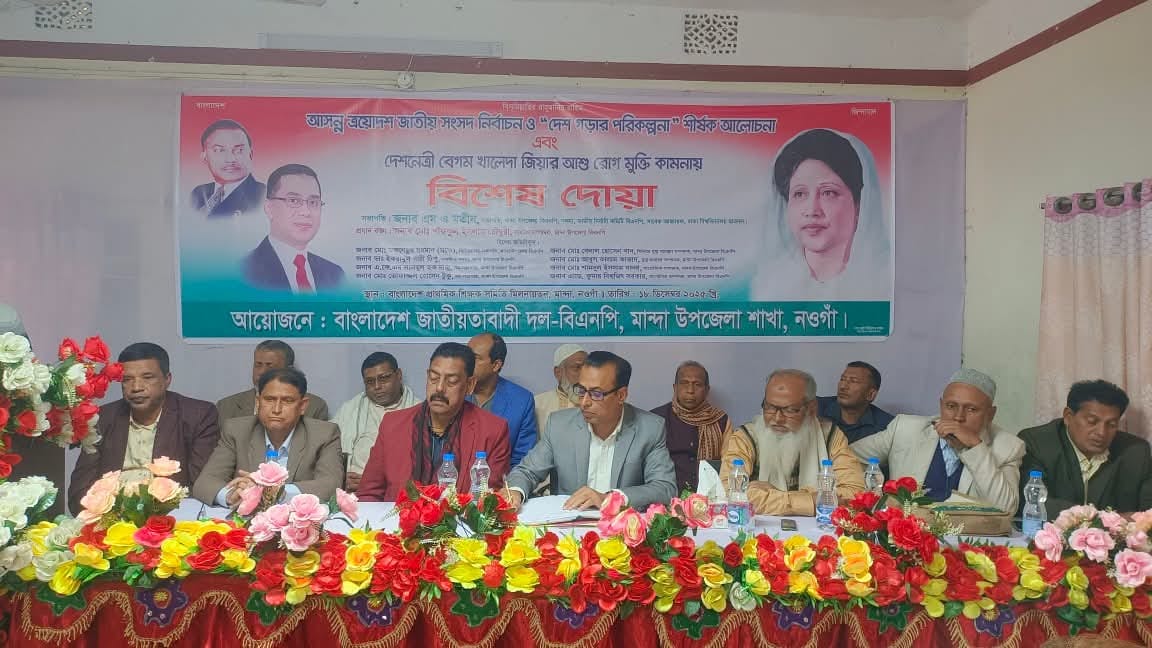 নওগাঁ প্রতিনিধিঃ নওগাঁর মান্দা উপজেলা বিএনপি’র উদ্যোগে আসন্ন ত্রয়োদশ জাতীয় সংসদ নির্বাচন ও “দেশ গড়ার পরিকল্পনা” শীর্ষক আলোচনা সভা অনুষ্ঠিত হয়েছে। এ উপলক্ষে বিএনপি চেয়ারপারসন ও সাবেক প্রধানমন্ত্রী দেশনেত্রী বেগম খালেদা জিয়ার আশু রোগমুক্তি কামনায় বিশেষ দোয়ার আয়োজন করা হয়।
